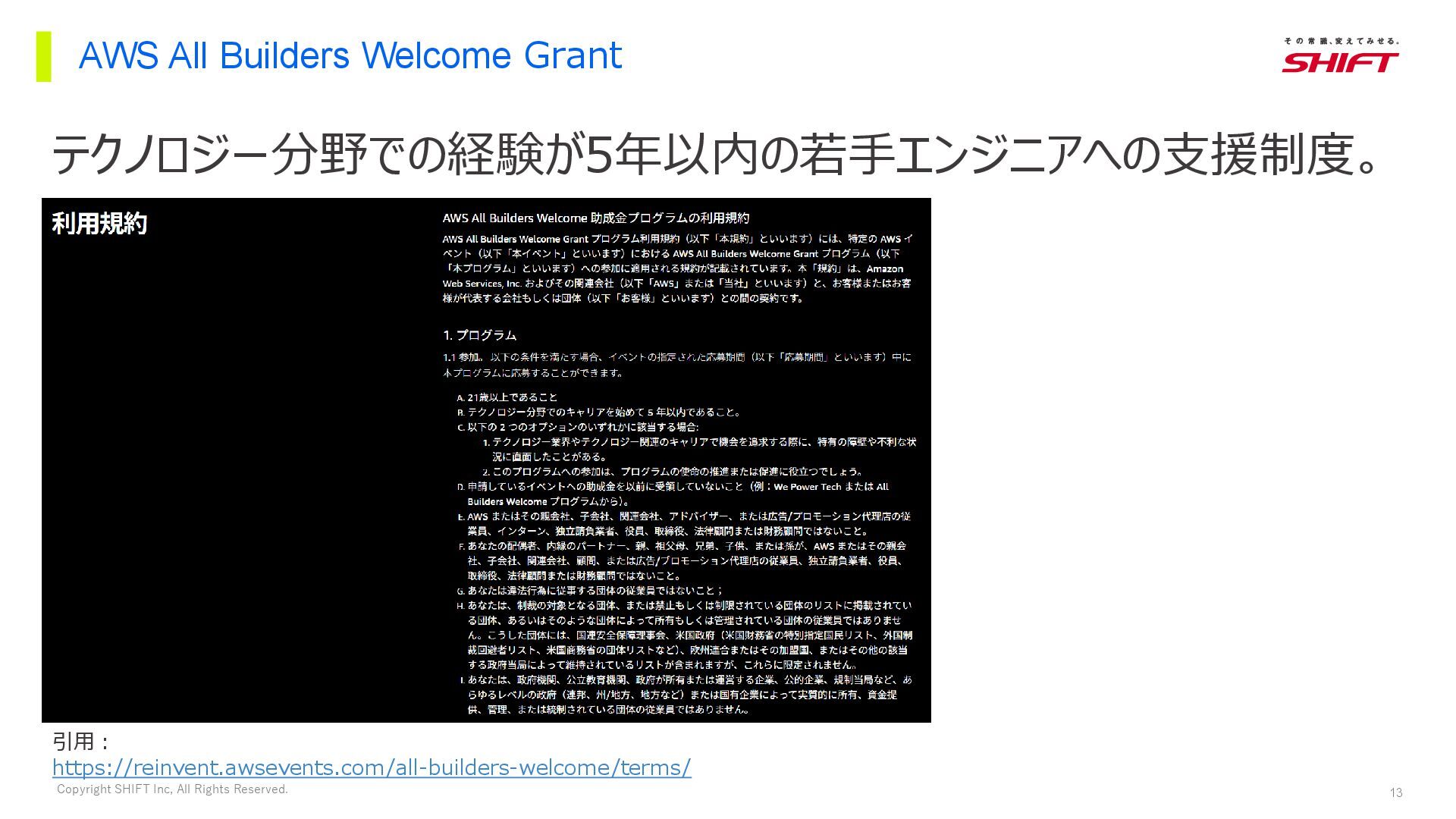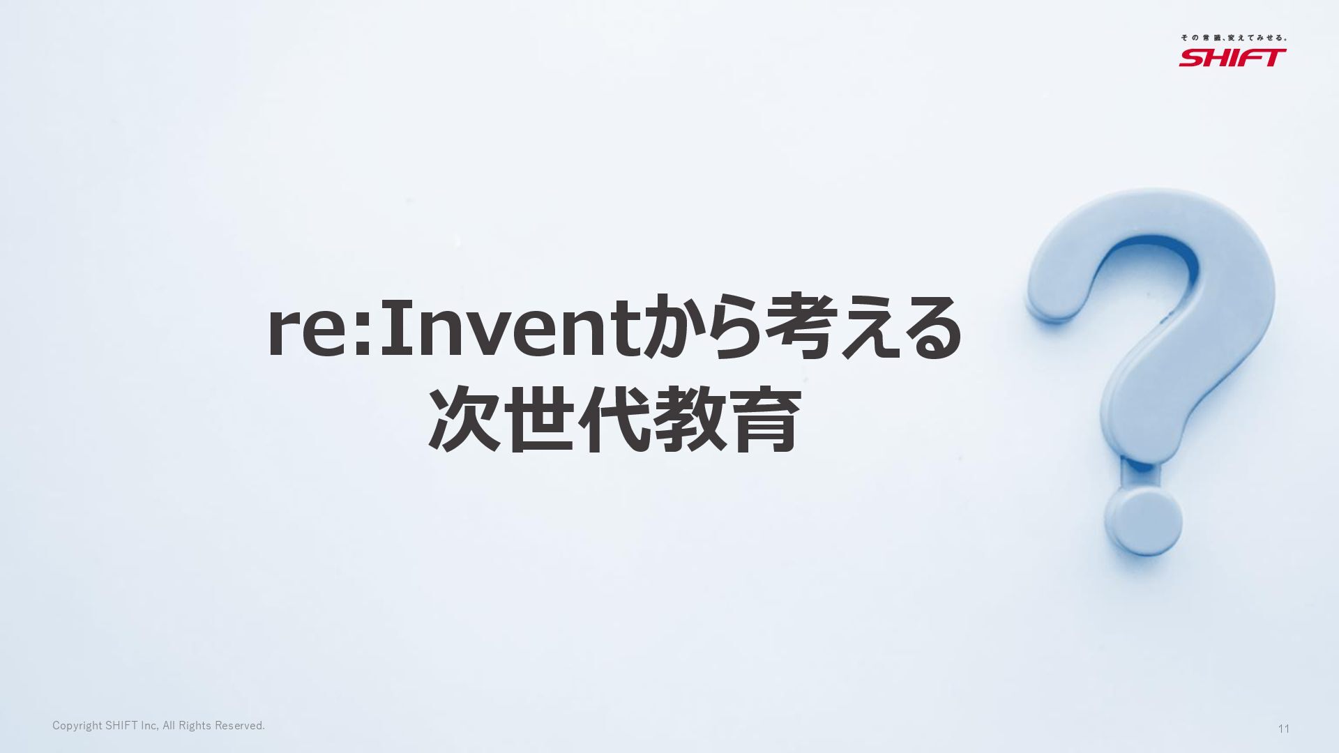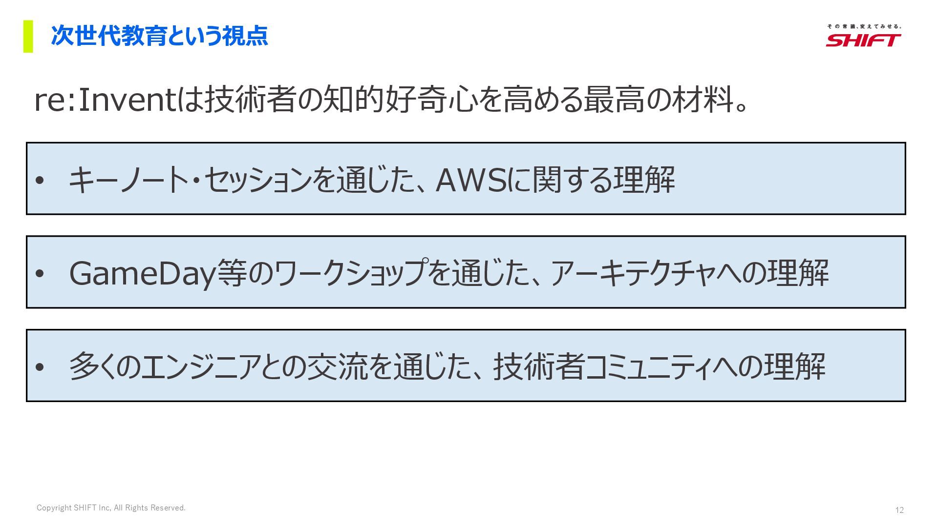 8. 12 Copyright SHIFT Inc, All Rights Reserved. 次世代教育という視点 re:Inventは技術者の知的好奇心を高める最高の材料。 •