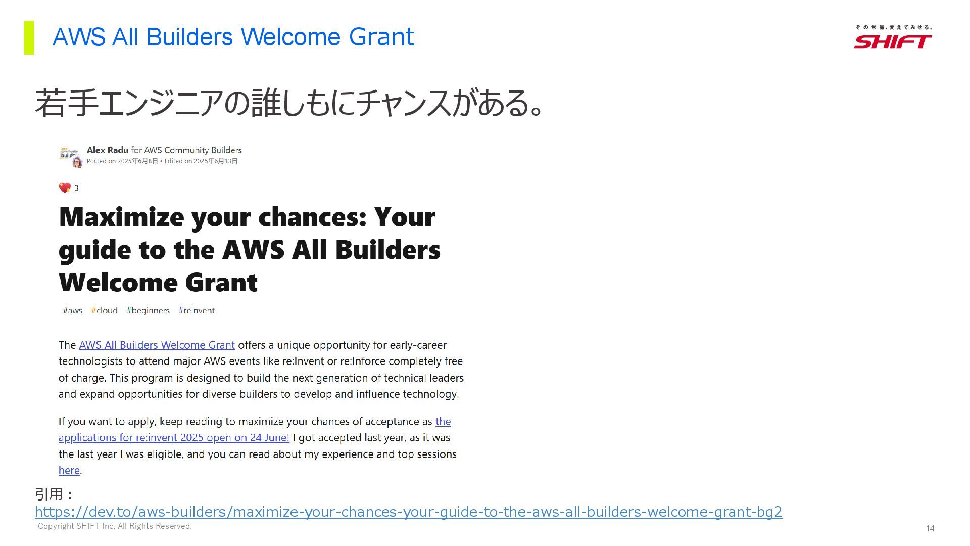 Welcome Grant 若手エンジニアの誰しもにチャンスがある。 引用: https://dev.to/aws-builders/maximize-your-chances-your-guide-to-the-aws-all-builders-welcome-grant-bg2