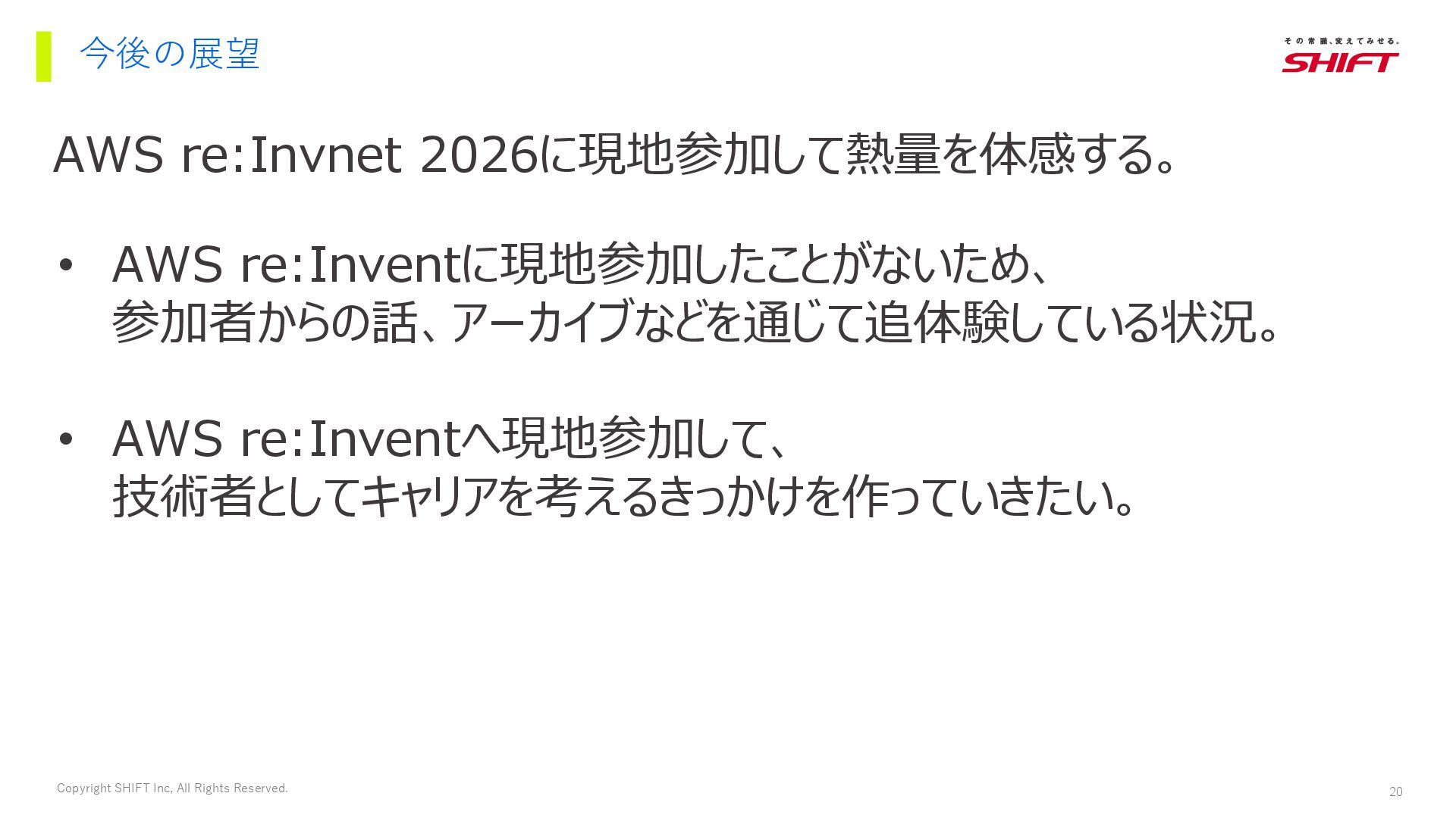12. 20 Copyright SHIFT Inc, All Rights Reserved. 今後の展望 AWS re:Invnet