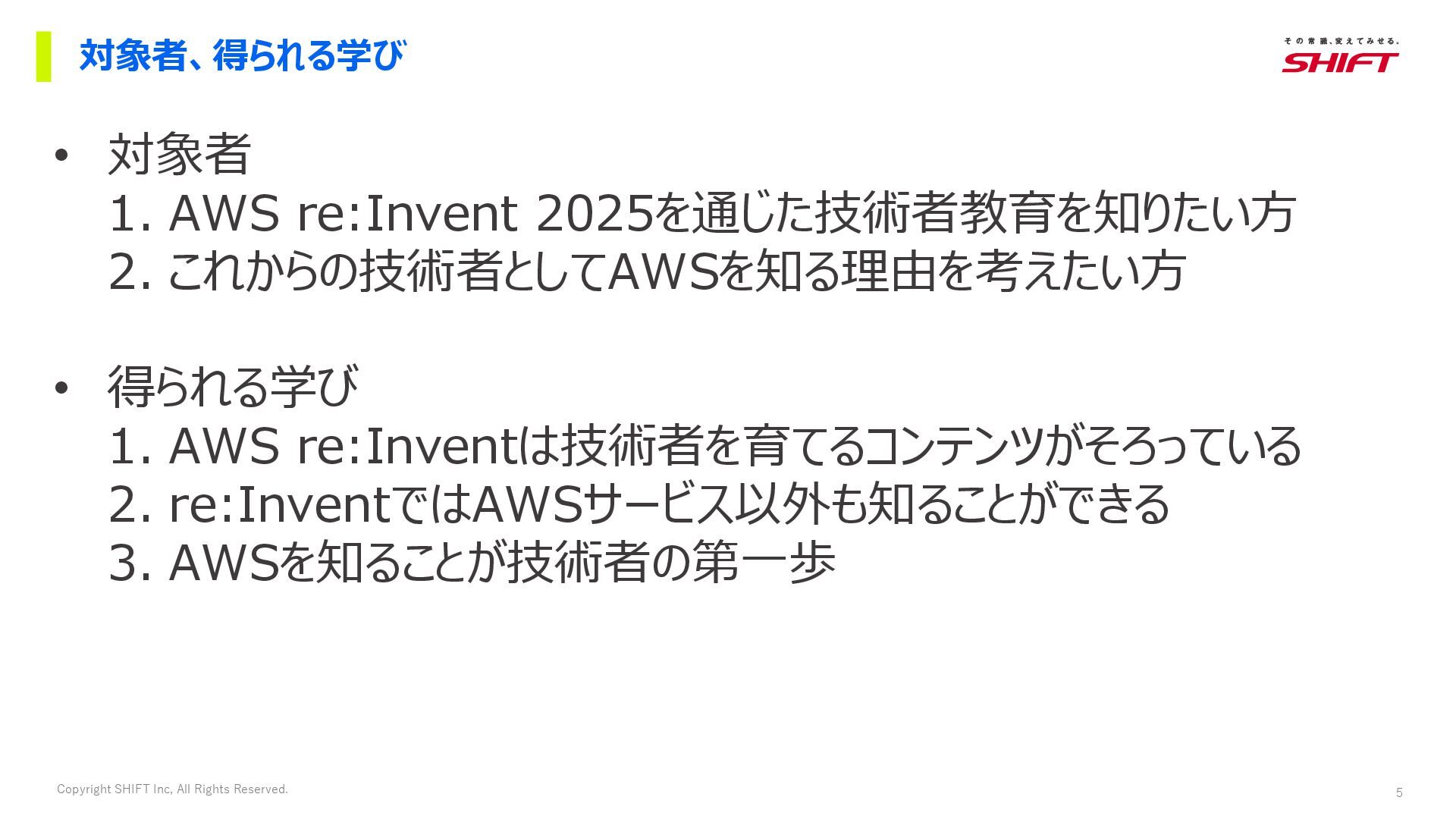 1. AWS re:Invent 2025を通じた技術者教育を知りたい方 2. これからの技術者としてAWSを知る理由を考えたい方 • 得られる学び 1. AWS re:Inventは技術者を育てるコンテンツがそろっている 2. re:InventではAWSサービス以外も知ることができる 3. AWSを知ることが技術者の第一歩