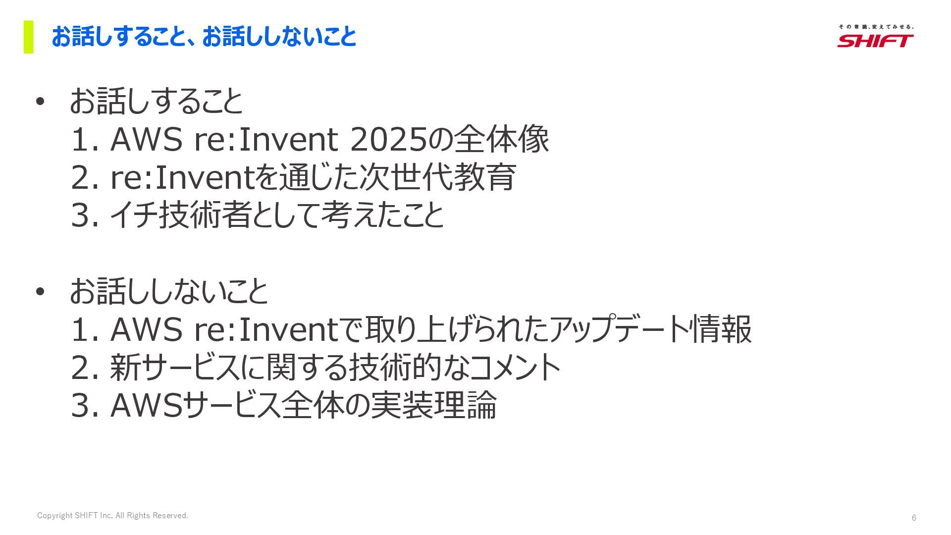 1. AWS re:Invent 2025の全体像 2. re:Inventを通じた次世代教育 3. イチ技術者として考えたこと • お話ししないこと 1. AWS re:Inventで取り上げられたアップデート情報 2. 新サービスに関する技術的なコメント 3. AWSサービス全体の実装理論