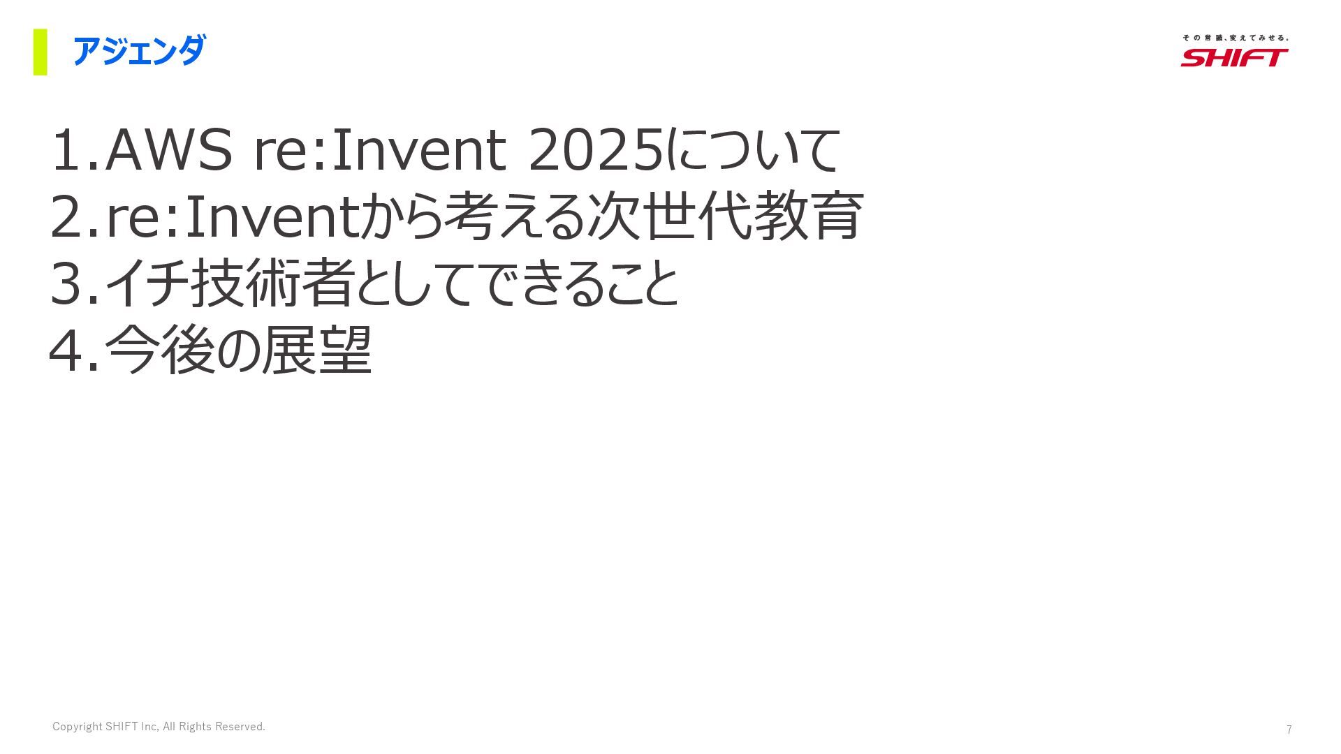 2025について 2.re:Inventから考える次世代教育 3.イチ技術者としてできること 4.今後の展望
