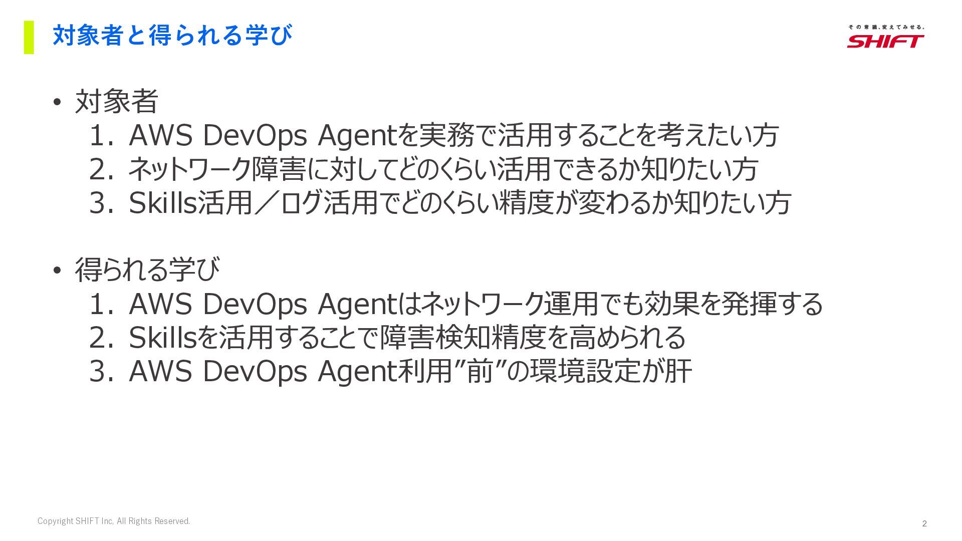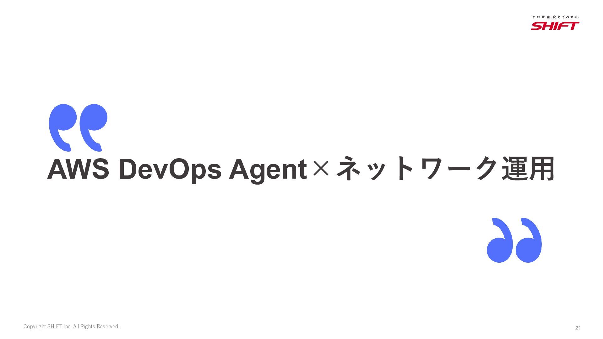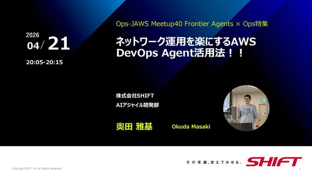 Inc, All Rights Reserved. 1 Ops-JAWS Meetup40 Frontier Agents × Ops特集 株式会社SHIFT AIアジャイル開発部 Okuda Masaki 21 04 20:05-20:15 奥田 雅基 ネットワーク運用を楽にするAWS DevOps Agent活用法!!