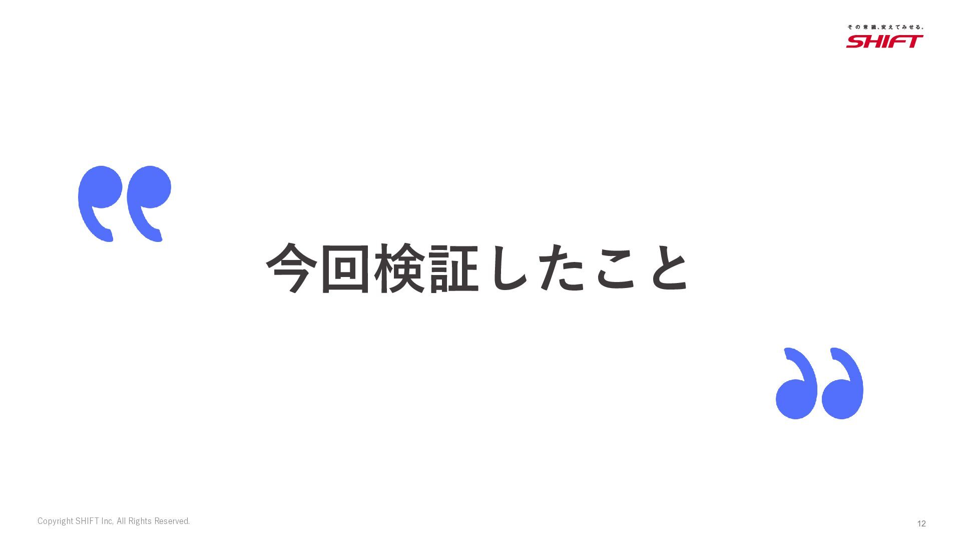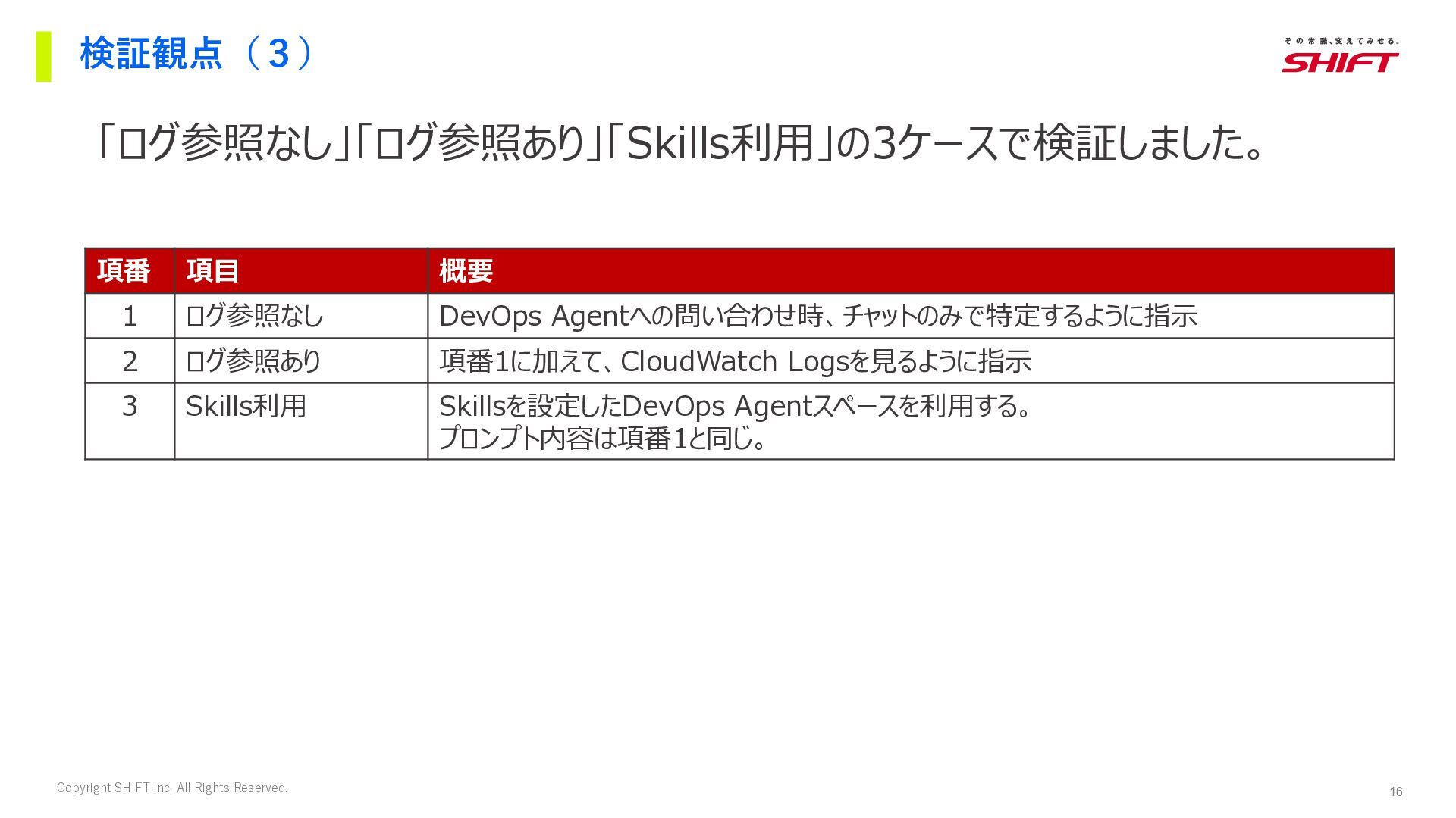 13. 16 Copyright SHIFT Inc, All Rights Reserved. 検証観点(3) 「ログ参照なし」「ログ参照あり」「Skills利用」の3ケースで検証しました。 項番