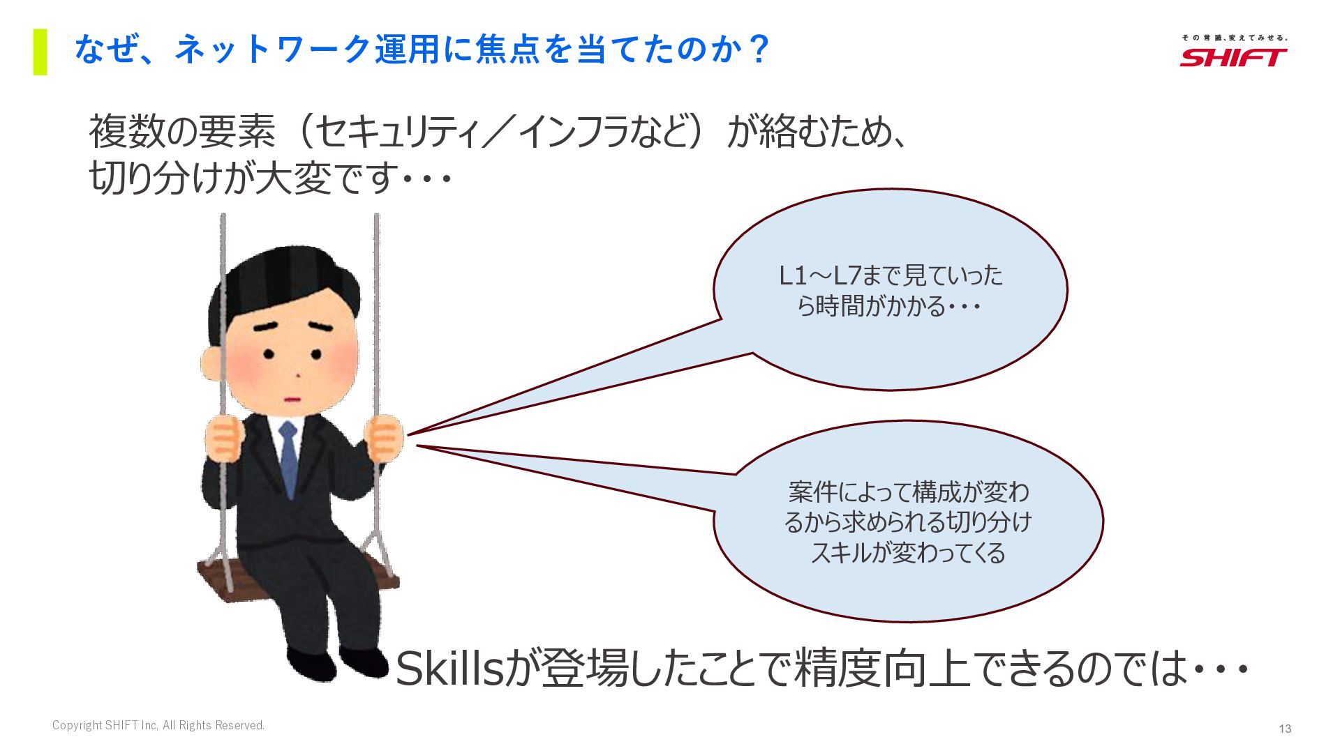 10. 13 Copyright SHIFT Inc, All Rights Reserved. なぜ、ネットワーク運用に焦点を当てたのか? 複数の要素(セキュリティ/インフラなど)が絡むため、 切り分けが大変です・・・