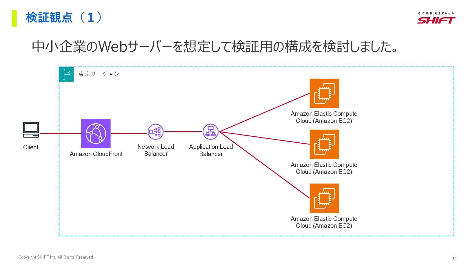 11. 14 Copyright SHIFT Inc, All Rights Reserved. 検証観点(1) 中小企業のWebサーバーを想定して検証用の構成を検討しました。 東京リージョン