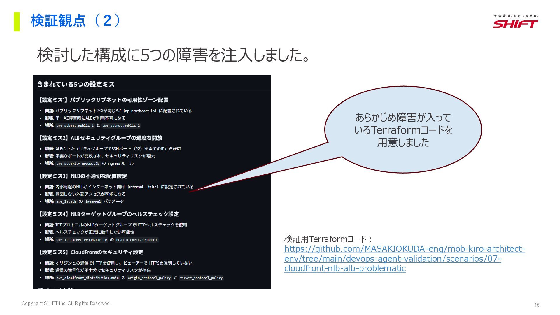 12. 15 Copyright SHIFT Inc, All Rights Reserved. 検証観点(2) 検討した構成に5つの障害を注入しました。 あらかじめ障害が入って