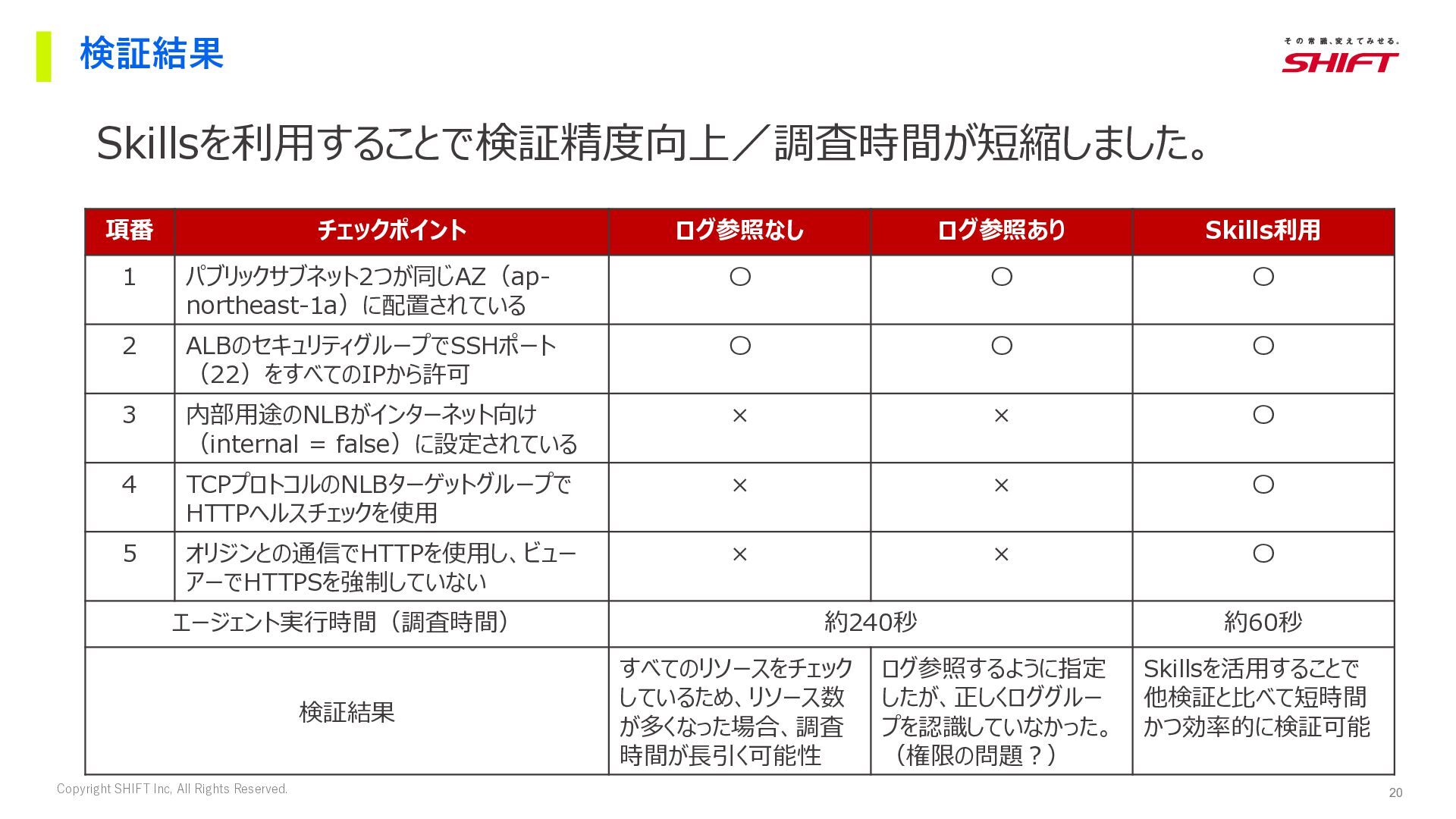 15. 20 Copyright SHIFT Inc, All Rights Reserved. 検証結果 Skillsを利用することで検証精度向上/調査時間が短縮しました。 項番