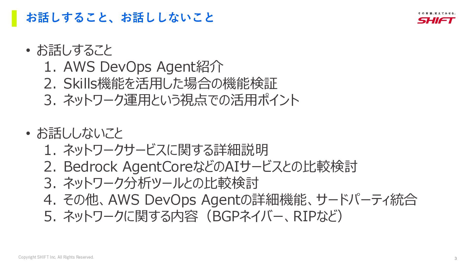1. AWS DevOps Agent紹介 2. Skills機能を活用した場合の機能検証 3. ネットワーク運用という視点での活用ポイント • お話ししないこと 1. ネットワークサービスに関する詳細説明 2. Bedrock AgentCoreなどのAIサービスとの比較検討 3. ネットワーク分析ツールとの比較検討 4. その他、AWS DevOps Agentの詳細機能、サードパーティ統合 5. ネットワークに関する内容(BGPネイバー、RIPなど)