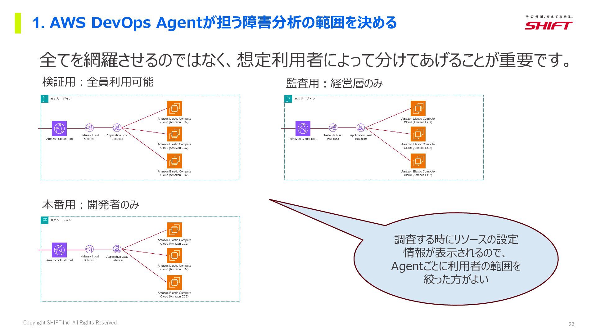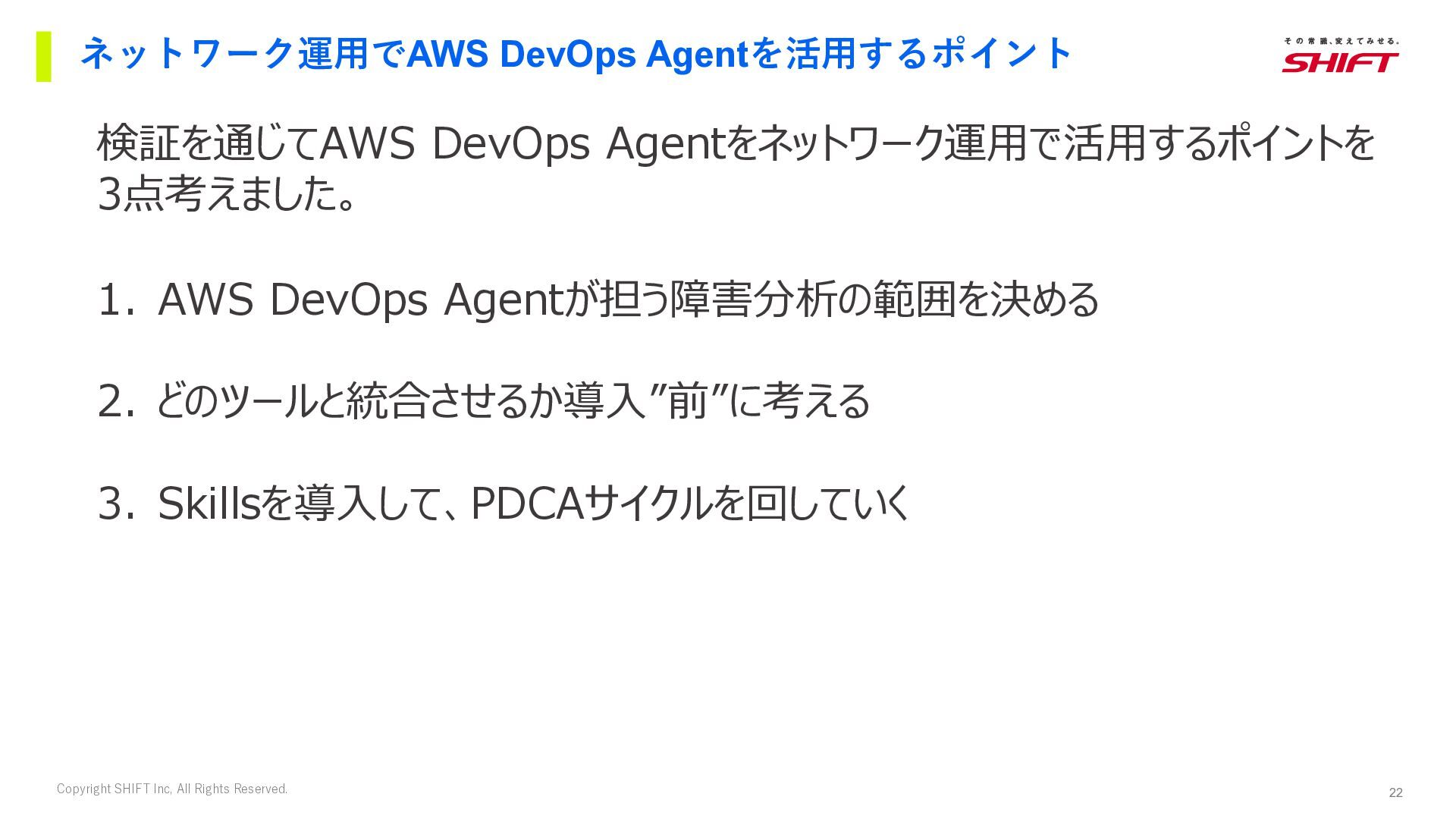16. 22 Copyright SHIFT Inc, All Rights Reserved. ネットワーク運用でAWS DevOps Agentを活用するポイント