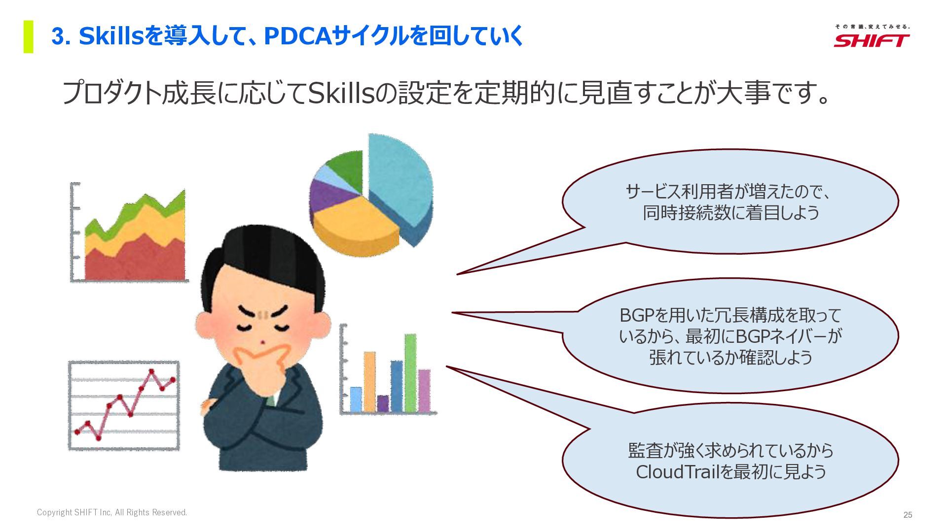 19. 25 Copyright SHIFT Inc, All Rights Reserved. 3. Skillsを導入して、PDCAサイクルを回していく プロダクト成長に応じてSkillsの設定を定期的に見直すことが大事です。