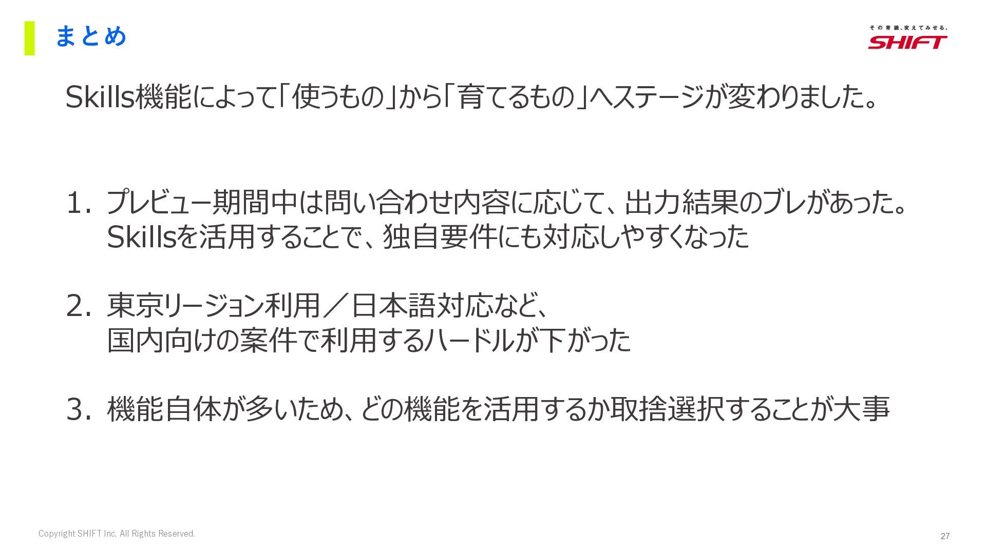 20. 27 Copyright SHIFT Inc, All Rights Reserved. まとめ Skills機能によって「使うもの」から「育てるもの」へステージが変わりました。 1.