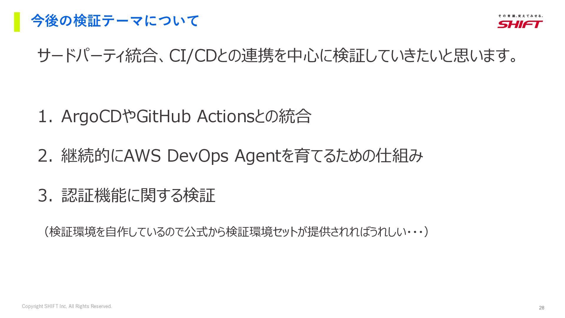 21. 28 Copyright SHIFT Inc, All Rights Reserved. 今後の検証テーマについて サードパーティ統合、CI/CDとの連携を中心に検証していきたいと思います。 1.