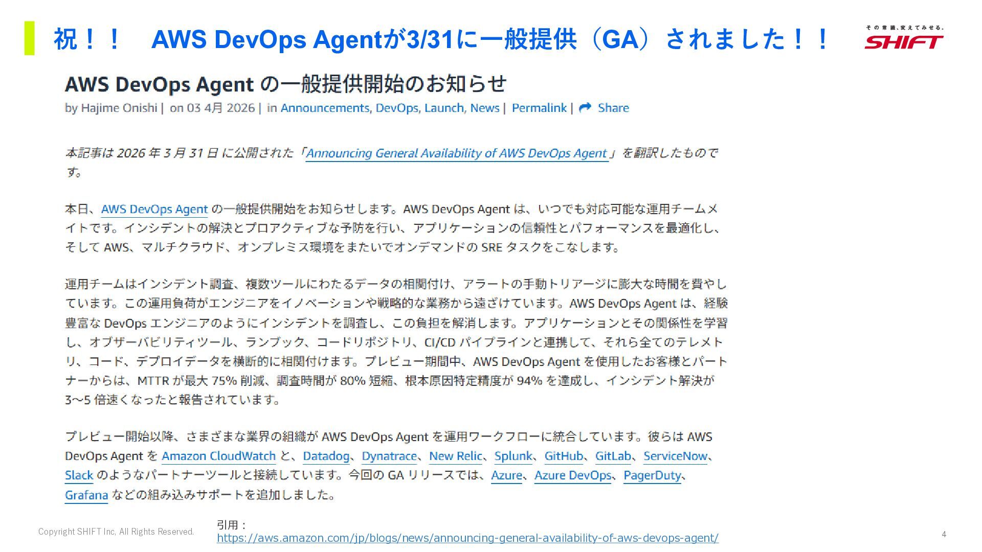 4. 4 Copyright SHIFT Inc, All Rights Reserved. 祝!! AWS DevOps