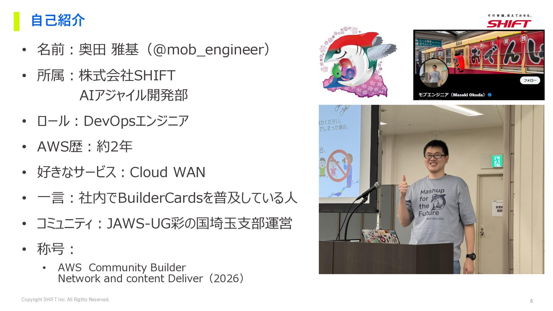 5. 5 Copyright SHIFT Inc, All Rights Reserved. • 名前:奥田 雅基(@mob_engineer)