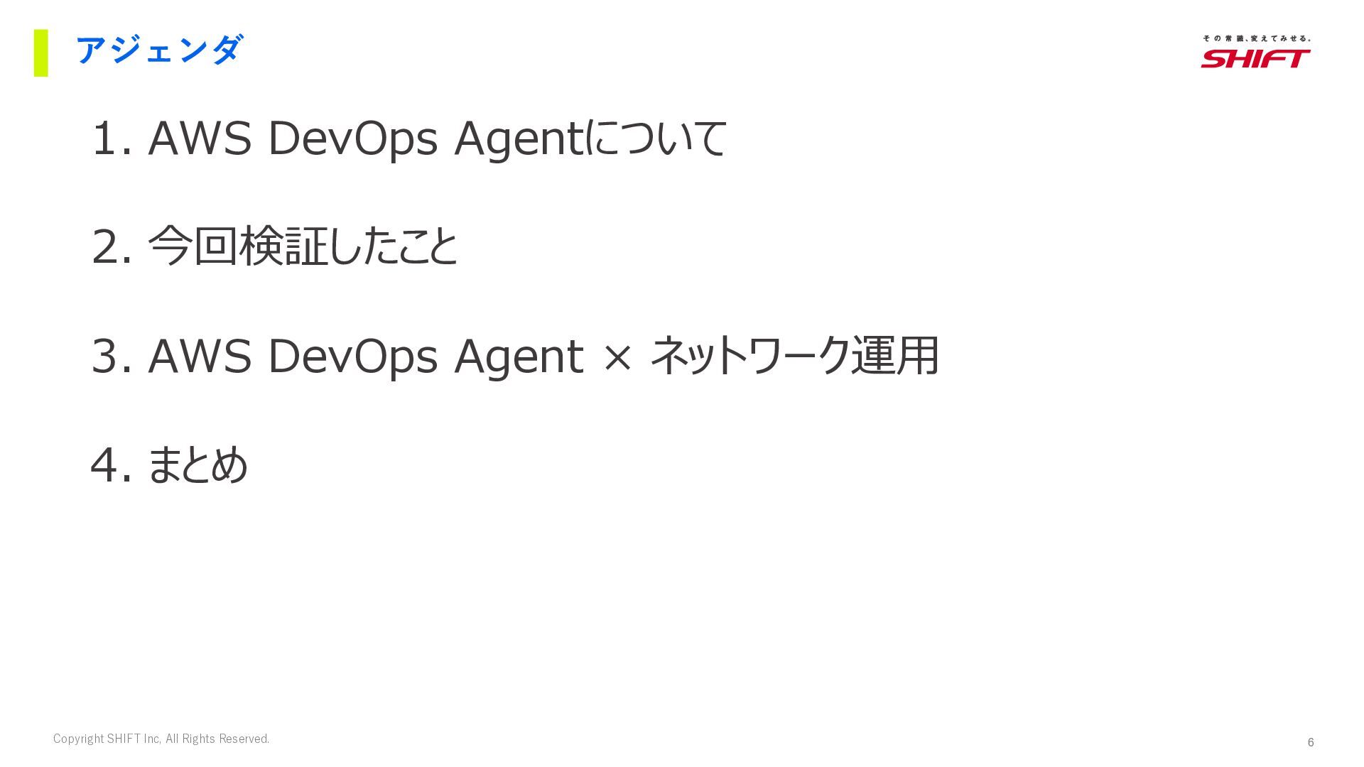 6. 6 Copyright SHIFT Inc, All Rights Reserved. アジェンダ 1. AWS