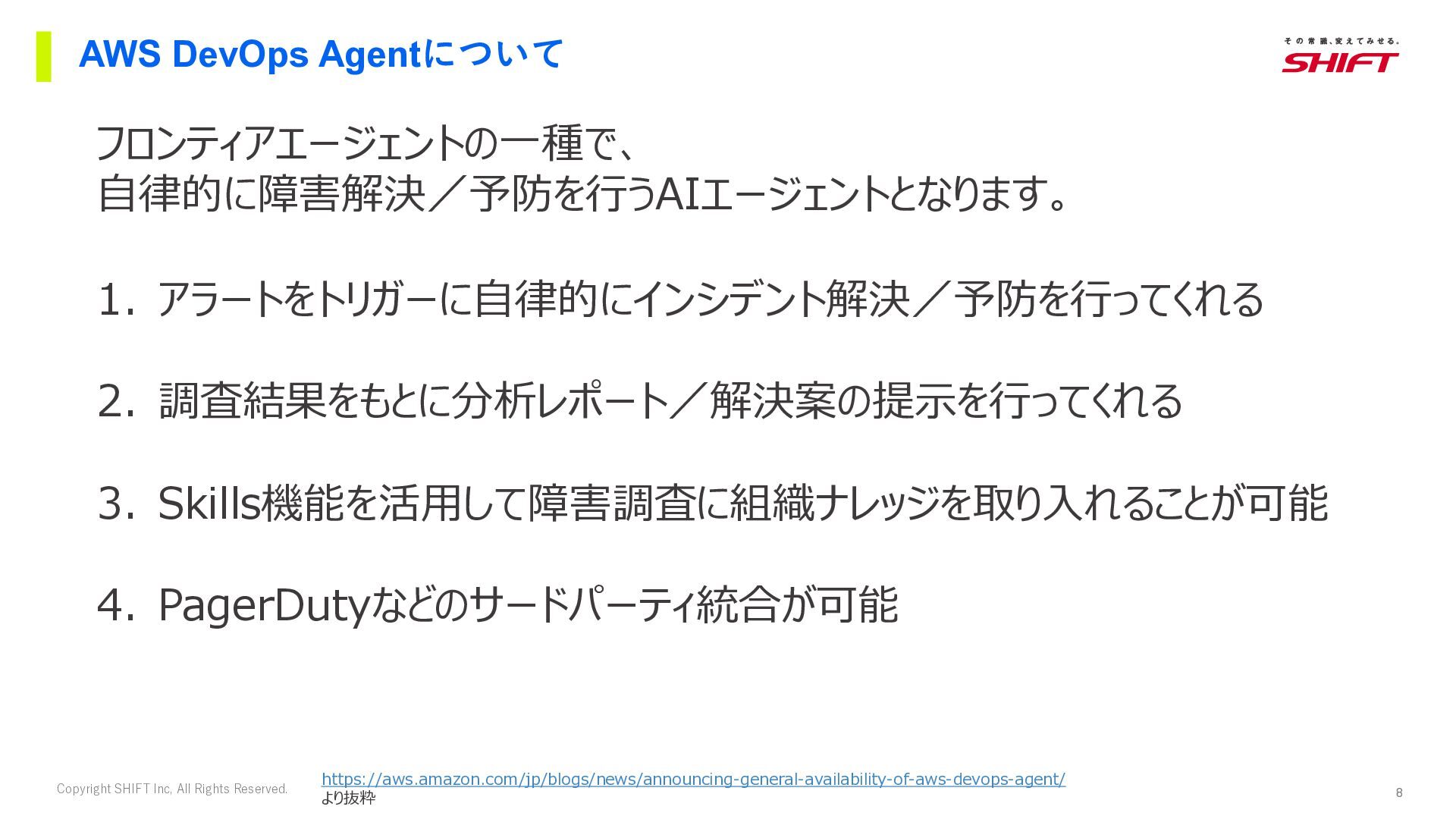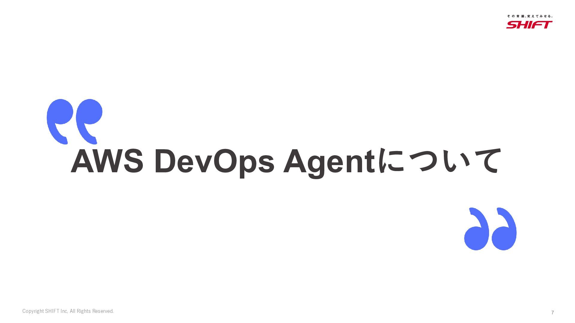 7. 8 Copyright SHIFT Inc, All Rights Reserved. AWS DevOps Agentについて