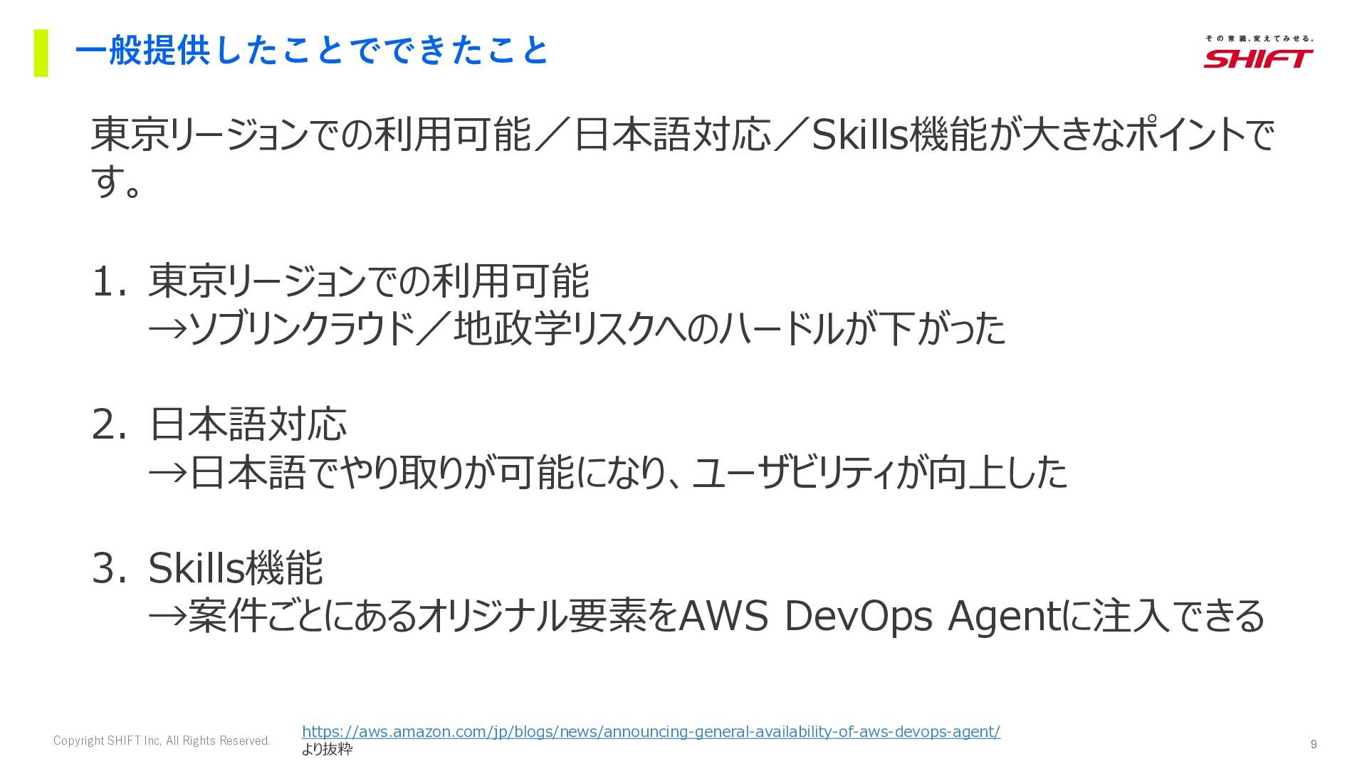 →ソブリンクラウド/地政学リスクへのハードルが下がった 2. 日本語対応 →日本語でやり取りが可能になり、ユーザビリティが向上した 3. Skills機能 →案件ごとにあるオリジナル要素をAWS DevOps Agentに注入できる 東京リージョンでの利用可能/日本語対応/Skills機能が大きなポイントで す。 https://aws.amazon.com/jp/blogs/news/announcing-general-availability-of-aws-devops-agent/ より抜粋
