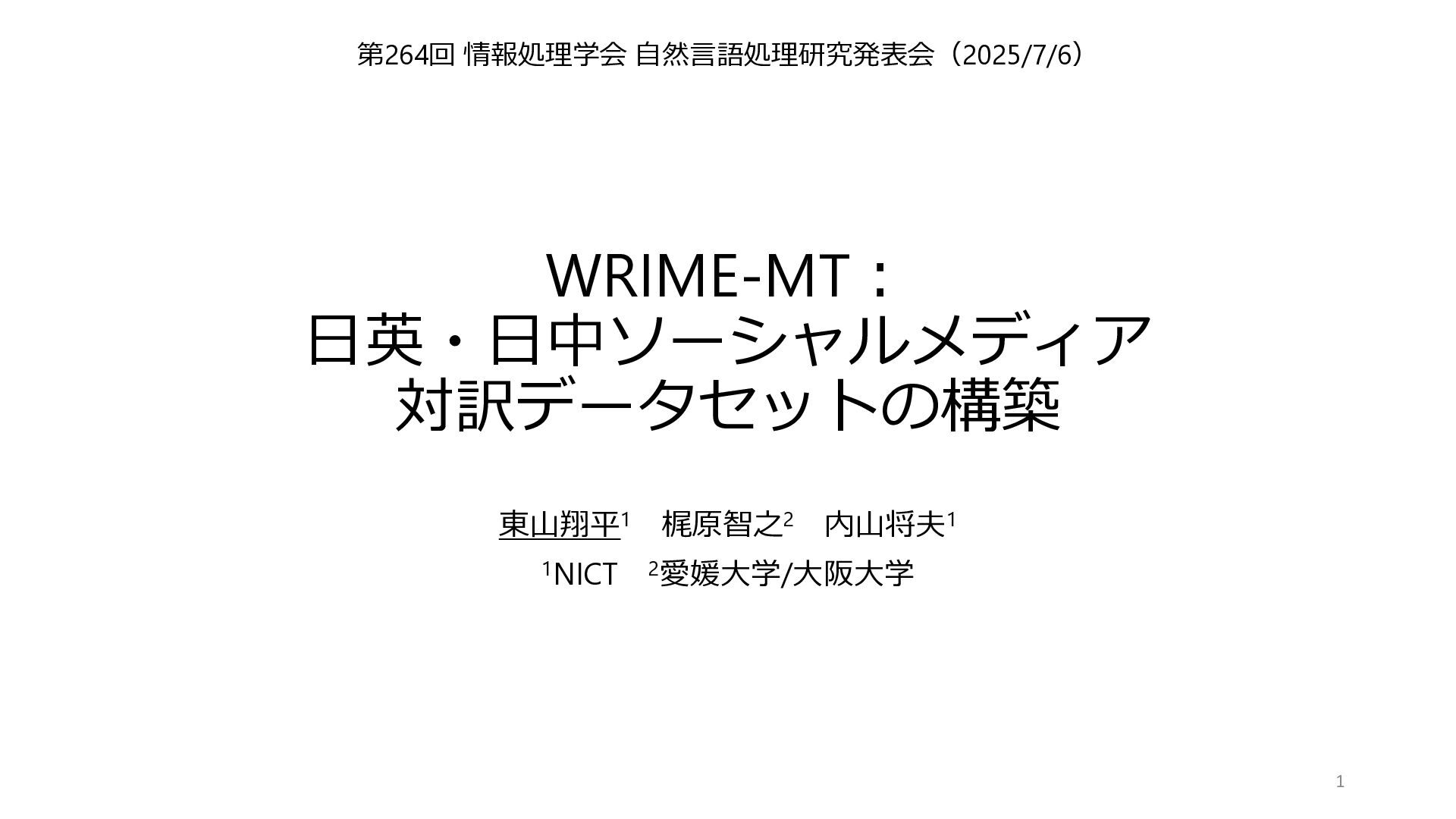 「WRIME-MT:日英・日中ソーシャルメディア対訳データセットの構築」