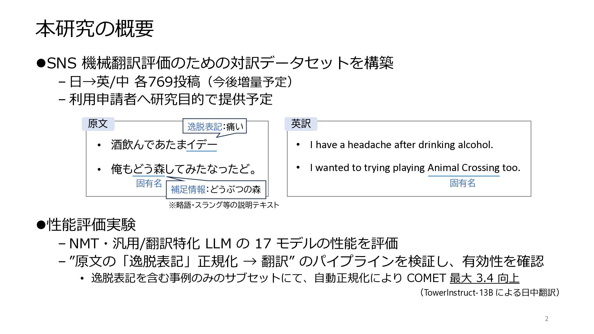 NMT・汎用/翻訳特化 LLM の 17 モデルの性能を評価 – ”原文の「逸脱表記」正規化 → 翻訳” のパイプラインを検証し、有効性を確認 • 逸脱表記を含む事例のみのサブセットにて、自動正規化により COMET 最大 3.4 向上 2 • 酒飲んであたまイデー • 俺もどう森してみたなったど。 固有名 • I have a headache after drinking alcohol. • I wanted to trying playing Animal Crossing too. 逸脱表記:痛い 補足情報:どうぶつの森 原文 英訳 固有名 ※略語・スラング等の説明テキスト (TowerInstruct-13B による日中翻訳)
