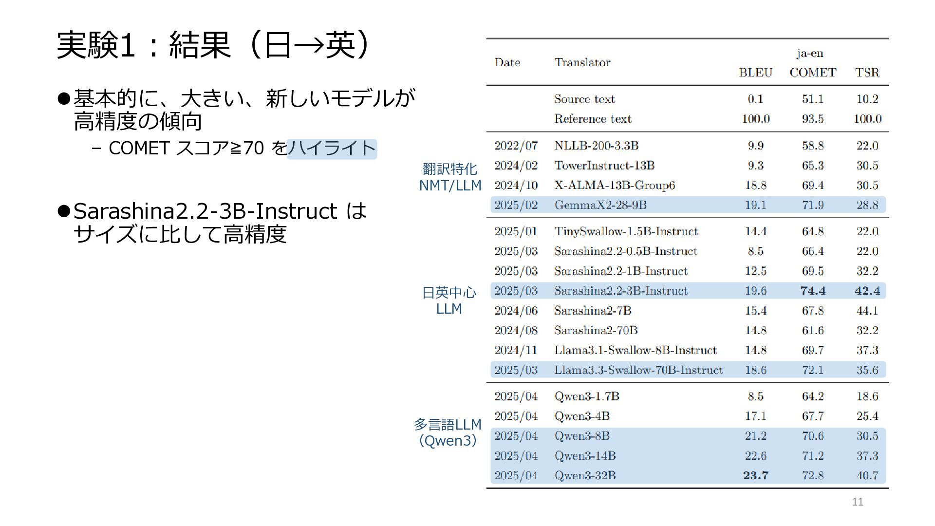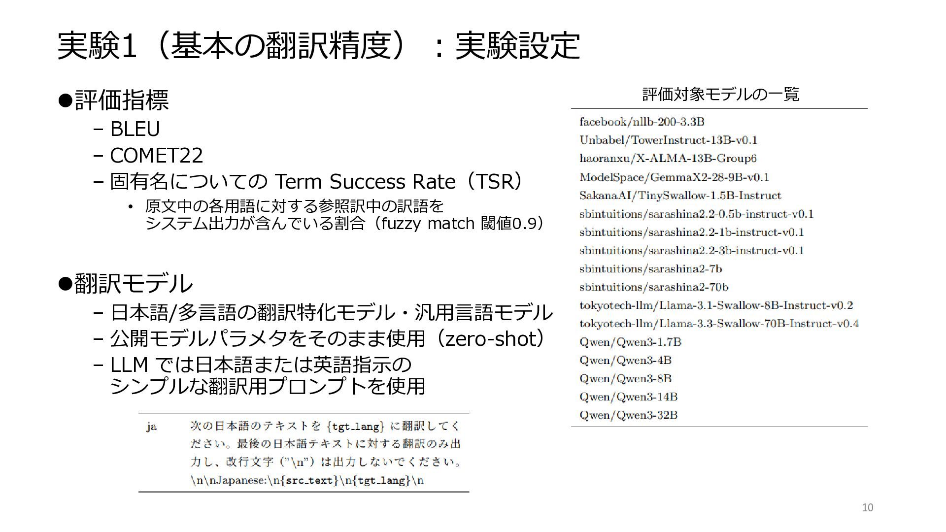 Rate(TSR) • 原文中の各用語に対する参照訳中の訳語を システム出力が含んでいる割合(fuzzy match 閾値0.9) ⚫翻訳モデル – 日本語/多言語の翻訳特化モデル・汎用言語モデル – 公開モデルパラメタをそのまま使用(zero-shot) – LLM では日本語または英語指示の シンプルな翻訳用プロンプトを使用 10 評価対象モデルの一覧