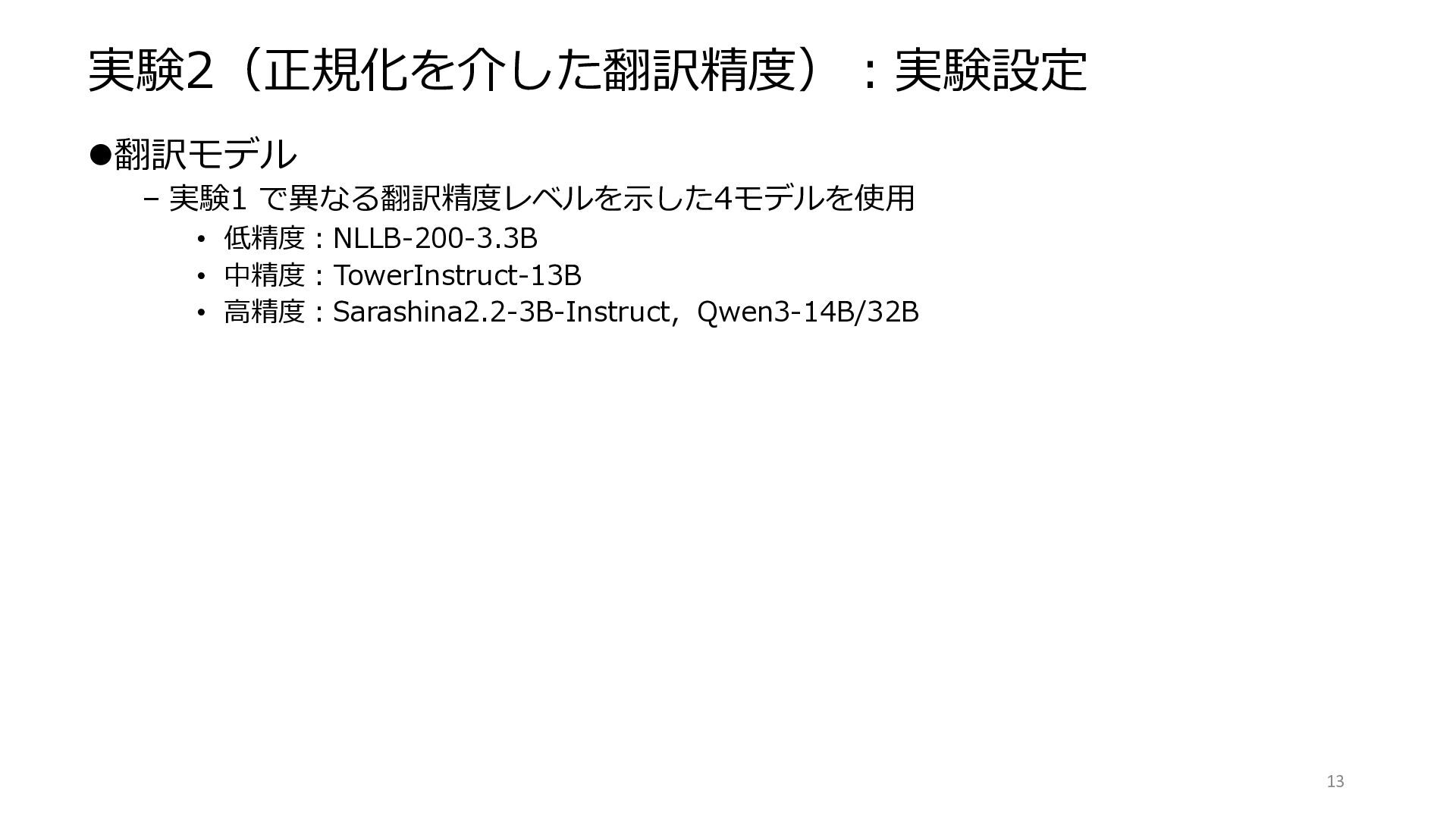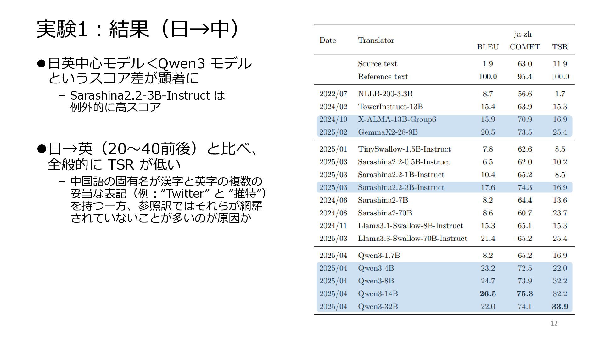 12. まとめと展望 ⚫[目的1]難しい事例からなる日本語 SNS 機械翻訳ベンチマークを構築する – 評価結果のスコア・エラー事例から、難しいベンチマークであることを確認 ⚫[目的2]本ドメインで、最先端・高性能モデルの機械翻訳精度を評価する – Sarashina2.2-3B-Inst、Qwen3 シリーズ、GemmaX2-28-9B