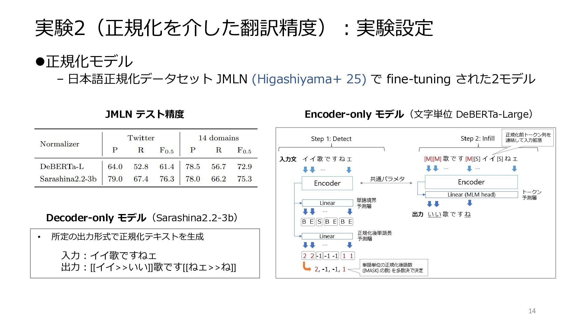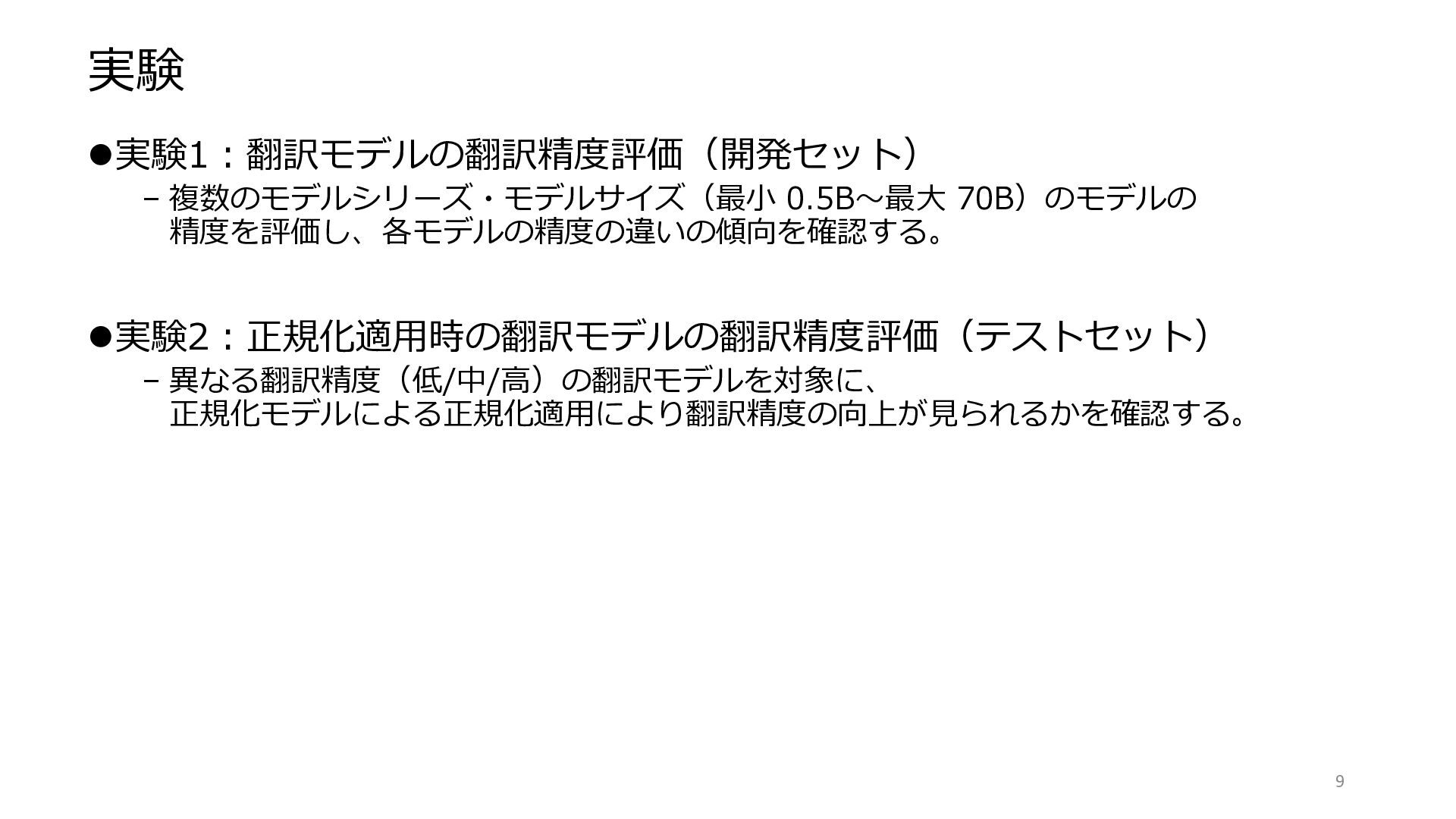 8. 実験2(正規化を介した翻訳精度):実験設定 ⚫正規化モデル – 日本語正規化データセット JMLN (Higashiyama+ 25) で fine-tuning された2モデル