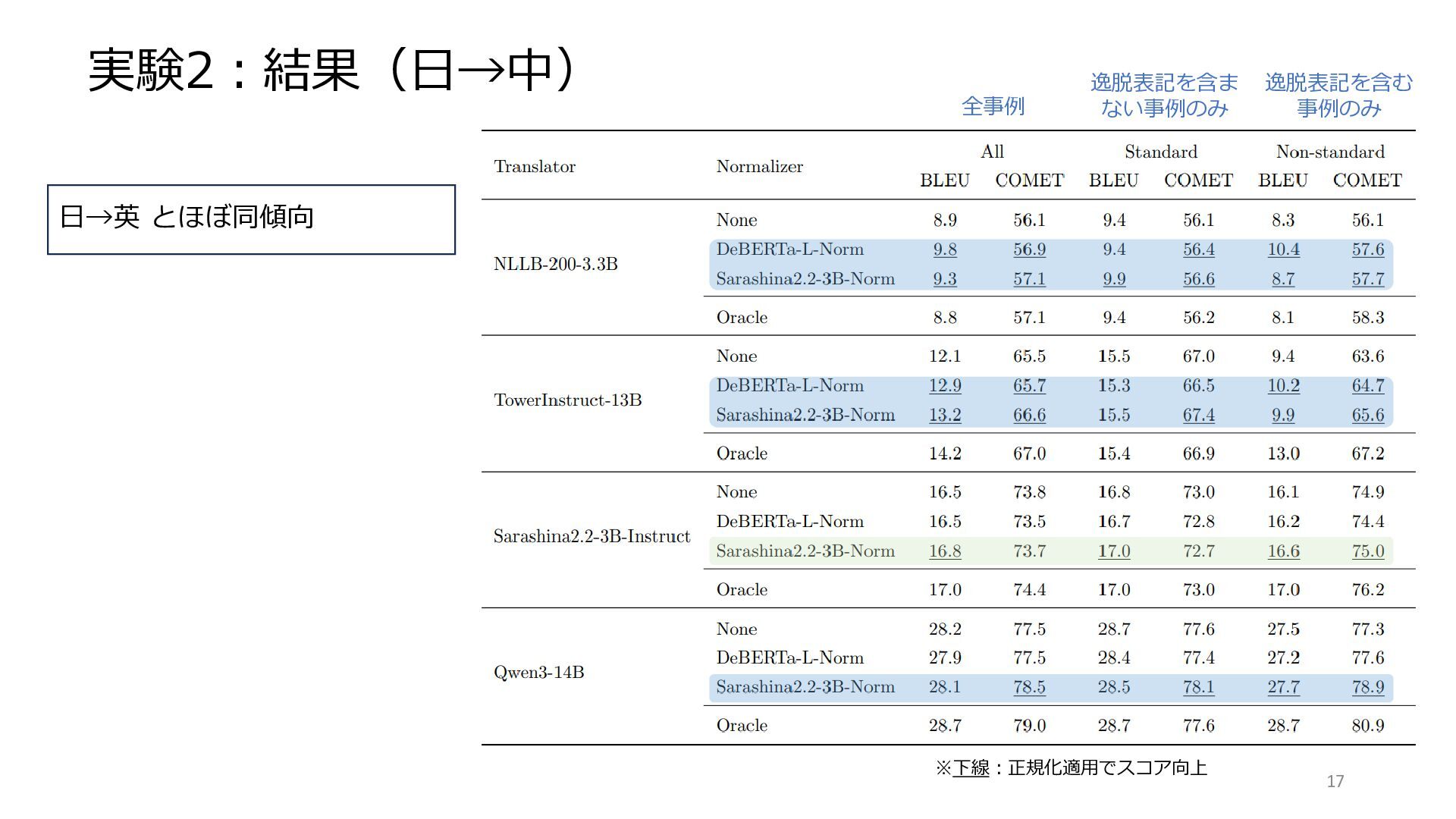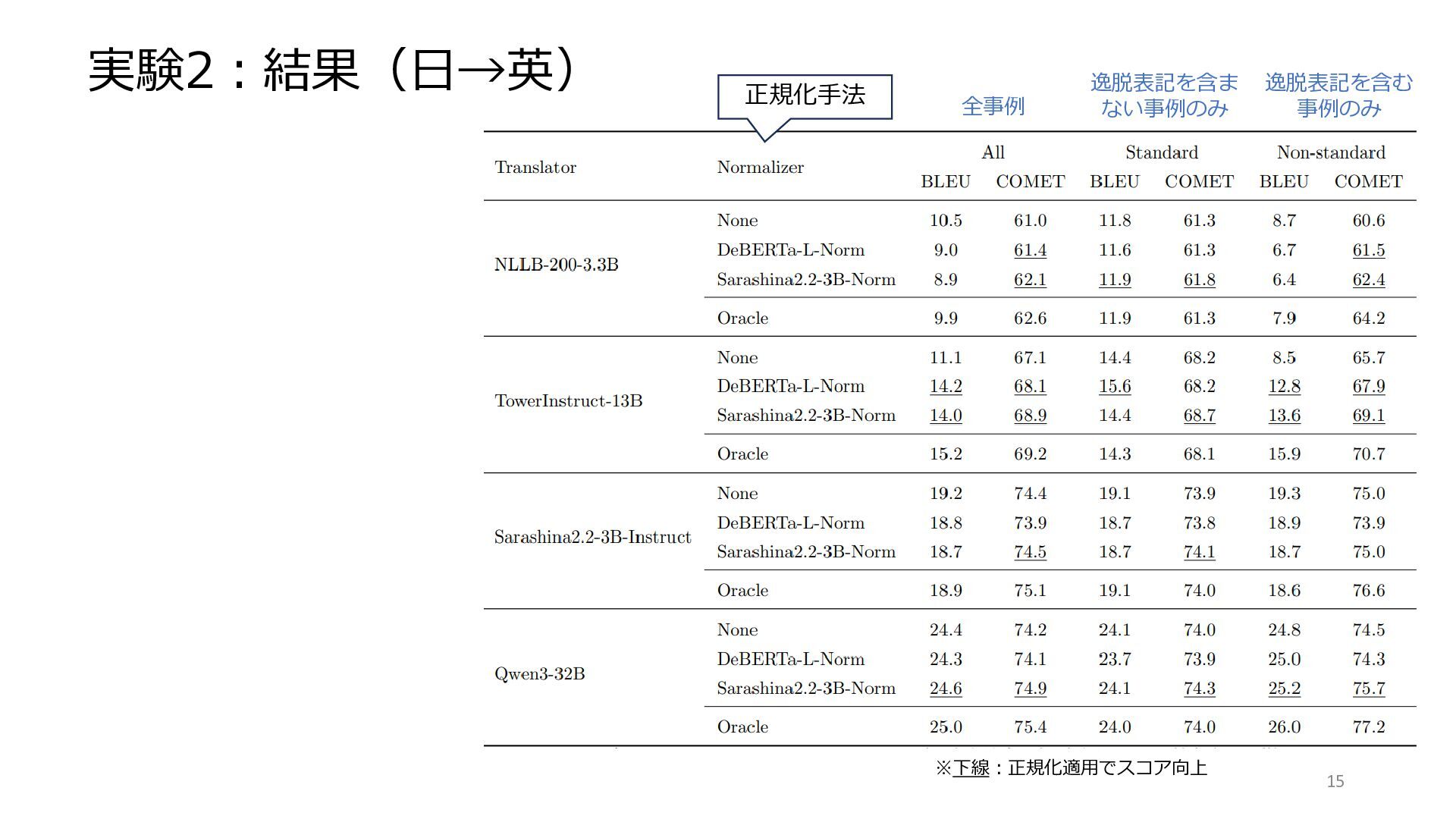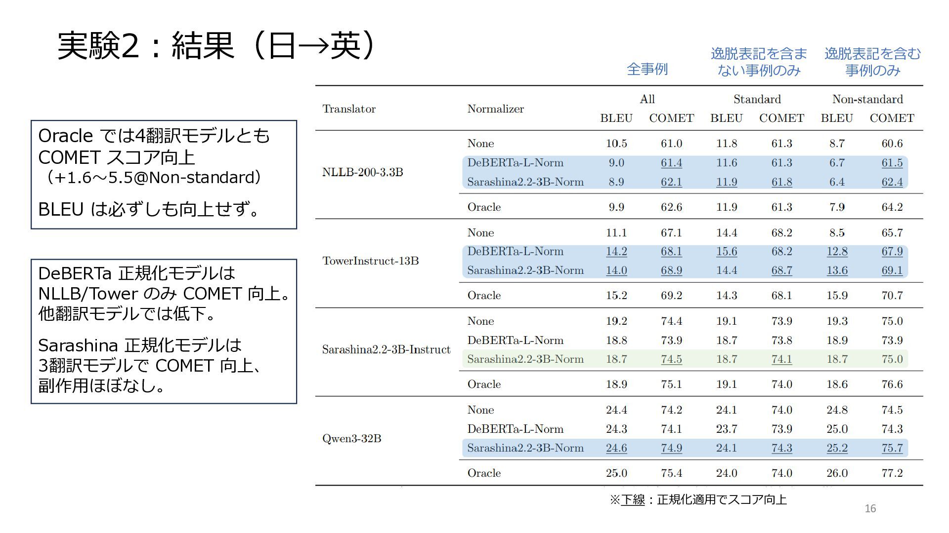 COMET スコア向上 (+1.6~5.5@Non-standard) BLEU は必ずしも向上せず。 DeBERTa 正規化モデルは NLLB/Tower のみ COMET 向上。 他翻訳モデルでは低下。 Sarashina 正規化モデルは 3翻訳モデルで COMET 向上、 副作用ほぼなし。