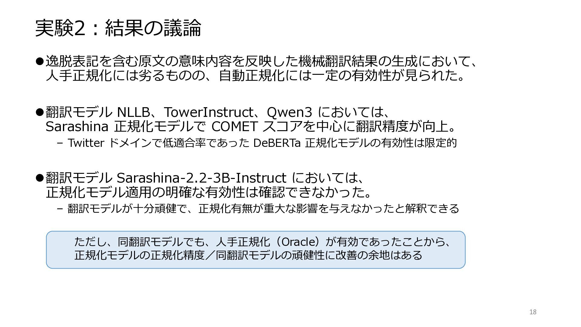 – Twitter ドメインで低適合率であった DeBERTa 正規化モデルの有効性は限定的 ⚫翻訳モデル Sarashina-2.2-3B-Instruct においては、 正規化モデル適用の明確な有効性は確認できなかった。 – 翻訳モデルが十分頑健で、正規化有無が重大な影響を与えなかったと解釈できる 18 ただし、同翻訳モデルでも、人手正規化(Oracle)が有効であったことから、 正規化モデルの正規化精度/同翻訳モデルの頑健性に改善の余地はある