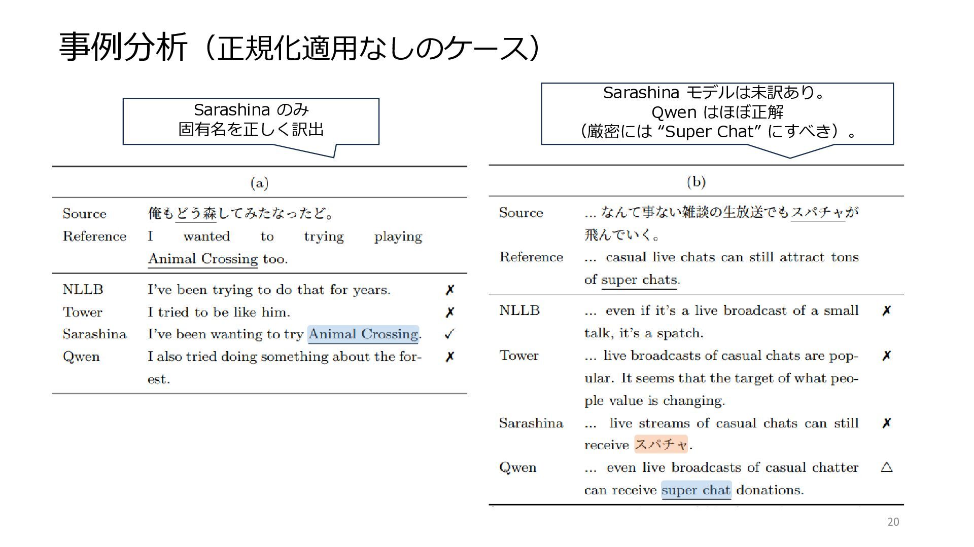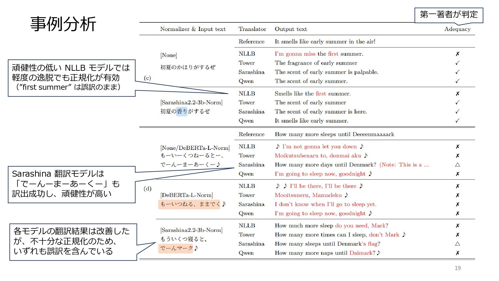 11. 事例分析 19 第一著者が判定 頑健性の低い NLLB モデルでは 軽度の逸脱でも正規化が有効 (”first summer” は誤訳のまま)