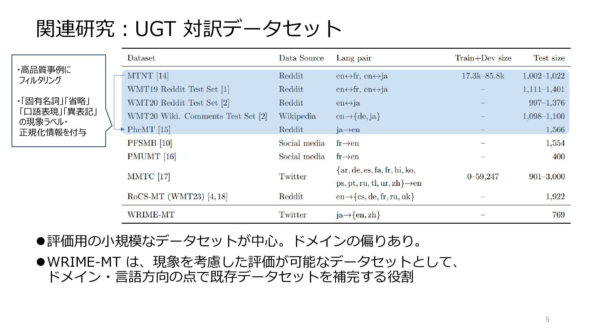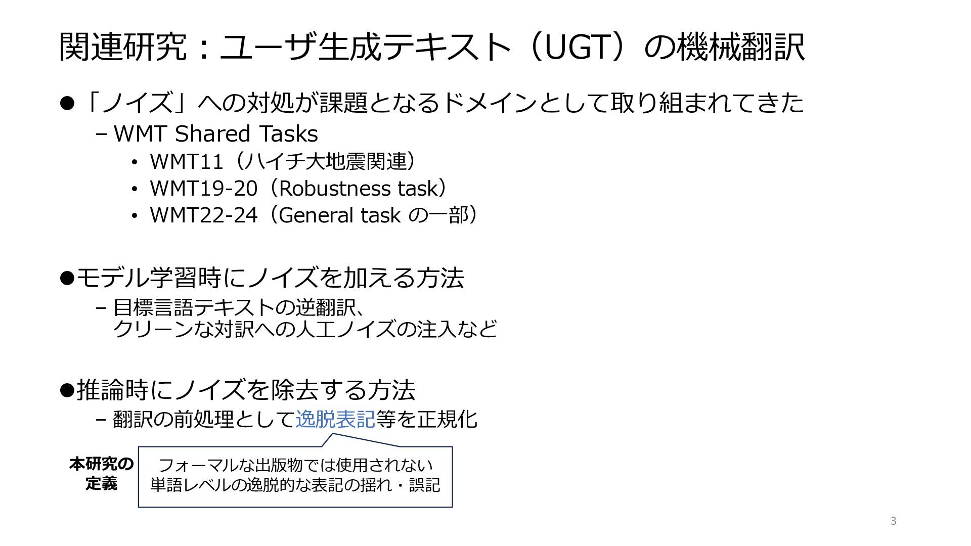 2. 関連研究:ユーザ生成テキスト(UGT)の機械翻訳 ⚫「ノイズ」への対処が課題となるドメインとして取り組まれてきた – WMT Shared Tasks • WMT11(ハイチ大地震関連) • WMT19-20(Robustness
