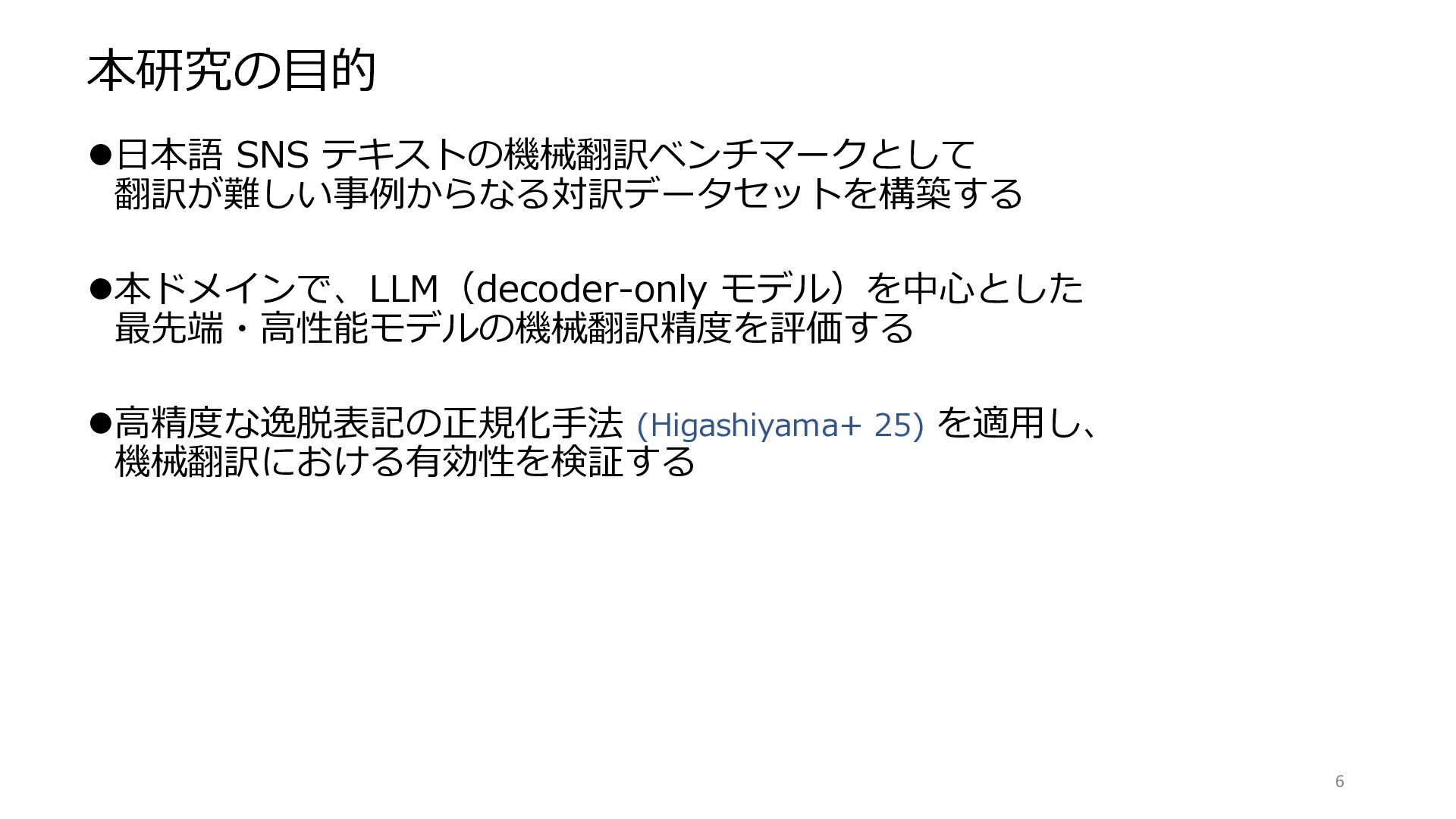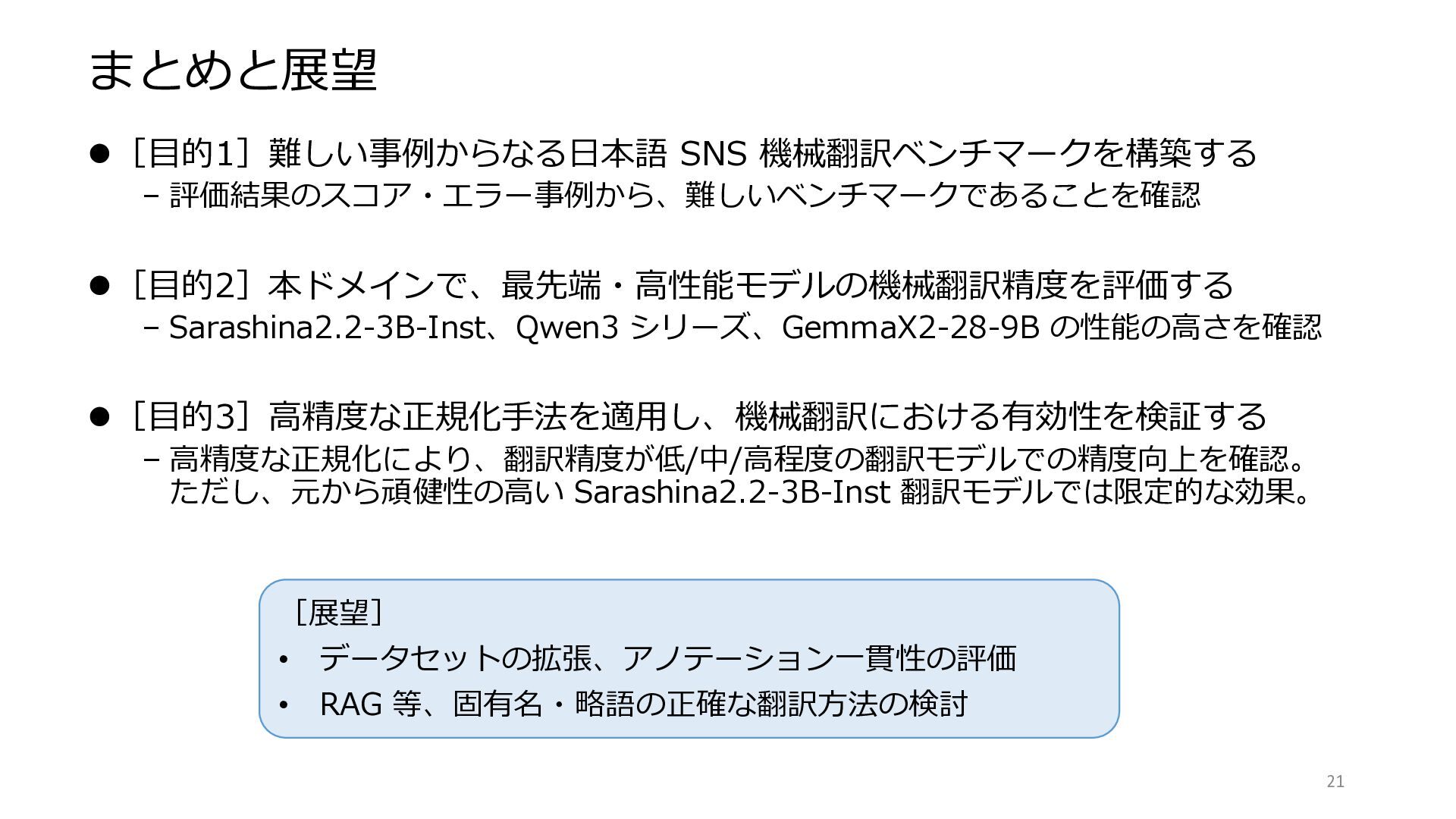 の性能の高さを確認 ⚫[目的3]高精度な正規化手法を適用し、機械翻訳における有効性を検証する – 高精度な正規化により、翻訳精度が低/中/高程度の翻訳モデルでの精度向上を確認。 ただし、元から頑健性の高い Sarashina2.2-3B-Inst 翻訳モデルでは限定的な効果。 21 [展望] • データセットの拡張、アノテーション一貫性の評価 • RAG 等、固有名・略語の正確な翻訳方法の検討