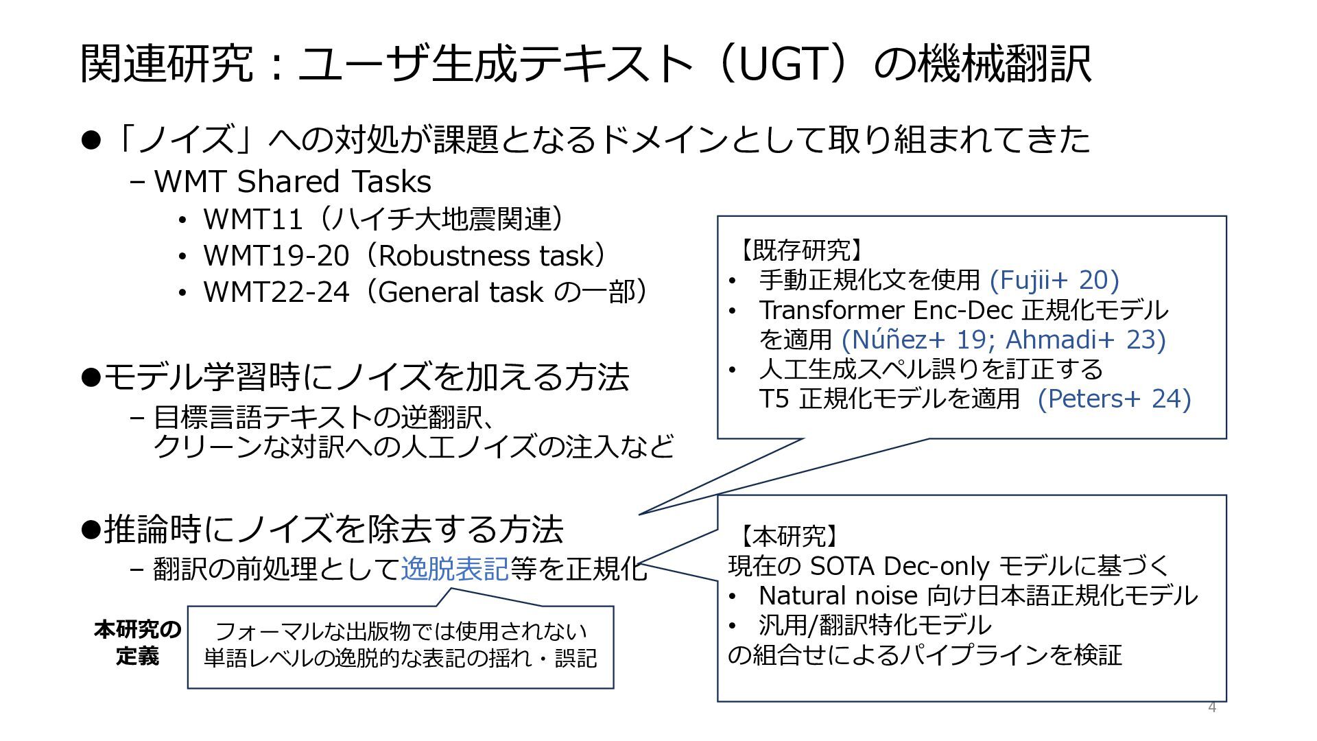 task) • WMT22-24(General task の一部) ⚫モデル学習時にノイズを加える方法 – 目標言語テキストの逆翻訳、 クリーンな対訳への人工ノイズの注入など ⚫推論時にノイズを除去する方法 – 翻訳の前処理として逸脱表記等を正規化 3 フォーマルな出版物では使用されない 単語レベルの逸脱的な表記の揺れ・誤記 本研究の 定義