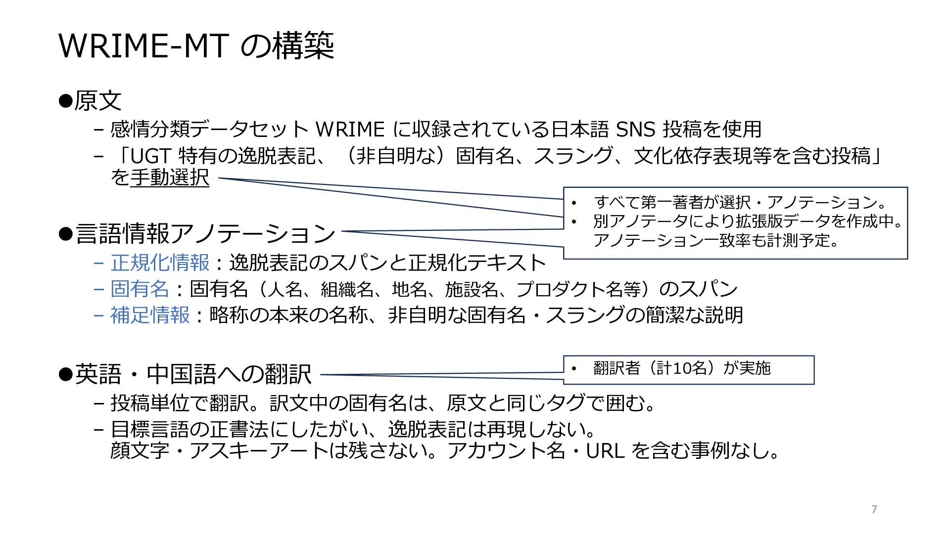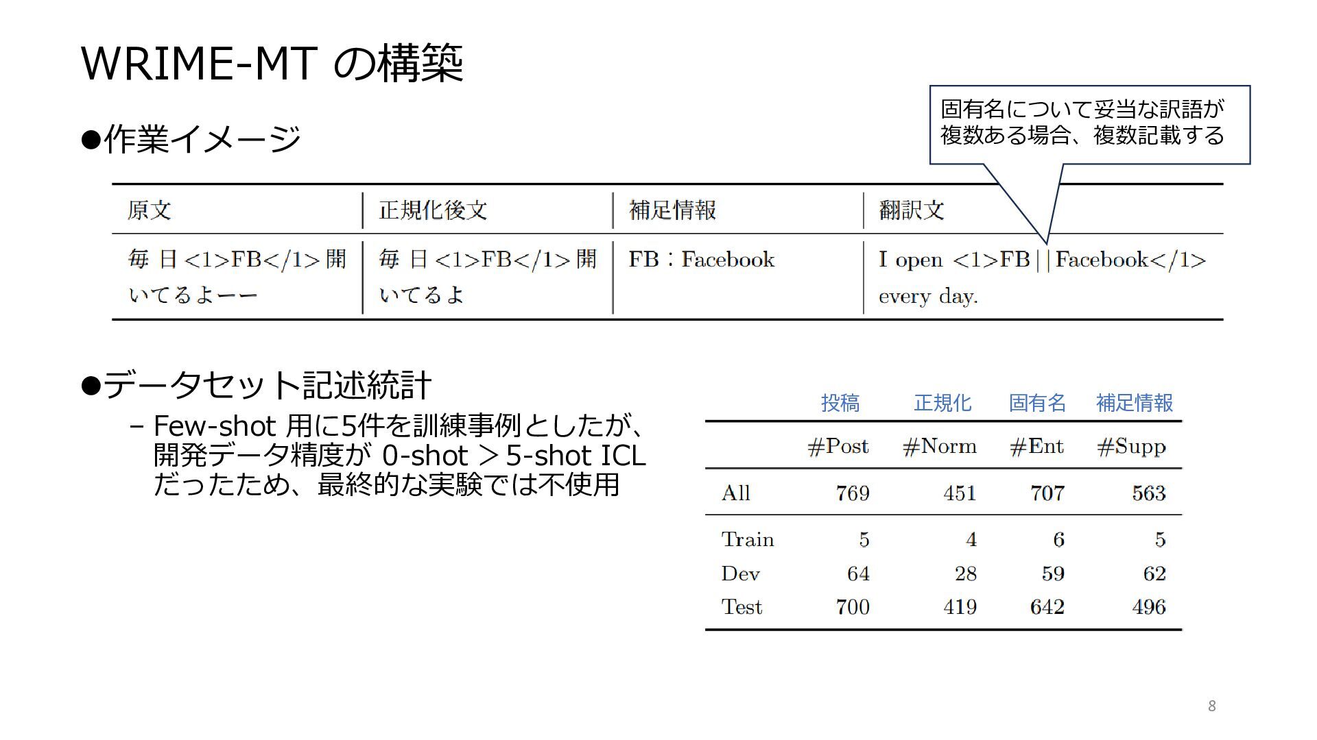 「UGT 特有の逸脱表記、(非自明な)固有名、スラング、文化依存表現等を含む投稿」 を手動選択 ⚫言語情報アノテーション – 正規化情報:逸脱表記のスパンと正規化テキスト – 固有名:固有名(人名、組織名、地名、施設名、プロダクト名等)のスパン – 補足情報:略称の本来の名称、非自明な固有名・スラングの簡潔な説明 ⚫英語・中国語への翻訳 – 投稿単位で翻訳。訳文中の固有名は、原文と同じタグで囲む。 – 目標言語の正書法にしたがい、逸脱表記は再現しない。 顔文字・アスキーアートは残さない。アカウント名・URL を含む事例なし。 7 • すべて第一著者が選択・アノテーション。 • 別アノテータにより拡張版データを作成中。 アノテーション一致率も計測予定。 • 翻訳者(計10名)が実施