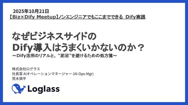 PoC ・プロトタイプ • 特定課題の解決 • 成功体験の創出 • AIツールの選定・導入 • AI推進担当がアプリを開発 • 限定的な利用と効果測定 • セキュリティチェック • AI推進担当 • 一部の現場協力 者 • 経営層 • 小さく始めて早く成功事例を作る • 費用対効果を明確にする • セキュリティ要件を満たす 第2 ・利用促進期 ・展開 ・横展開 • 成功モデルの横展開 • 利用者拡大 • 開発したアプリを他部署へ展開 • 研修やマニュアルを整備 • 利用者からのフィードバックを収 集 • AI推進担当 • 現場リーダー • 一般利用者 • 利用のハードルを下げる工夫 • 成功事例の共有とメリットの訴 求 第3 定着・改善期 (文化醸成) • 全社的なAI活用の文 化醸成と改善サイクル の確立 • フィードバックに基づくアプリ改修 • 活用状況のモニタリングと評価 • データ基盤やルールを整備 • AI推進担当 • 現場リーダー • IT部門 • 一般利用者 • 現場主導で改善サイクルを回す 仕組み • 効果測定と投資対効果(ROI) の可視化 第4 民主化・自律期 (全員参加) • 全員が自律的にAIを 活用し、継続的に業務 を改善する • 全社的なAIリテラシー教育 • 市民開発者(※)の育成 • ガバナンスルールの下での自由 な開発 • 全従業員 • AI推進担当 • IT部門 • 「自分たちで業務を良くする」文 化の醸成 • セキュリティと品質を担保する仕 組み フェーズ・立場・制約条件は、人によって『本当に バラバラ』 *ネットで色々な事例があるが制約条件や状況が違うので注意。特に個人利用は制約条件が少ないので別物と捉える