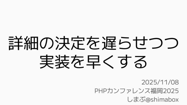 詳細の決定を遅らせつつ 実装を早くする 2025/11/08 PHPカンファレンス福岡2025 しまぶ@shimabox