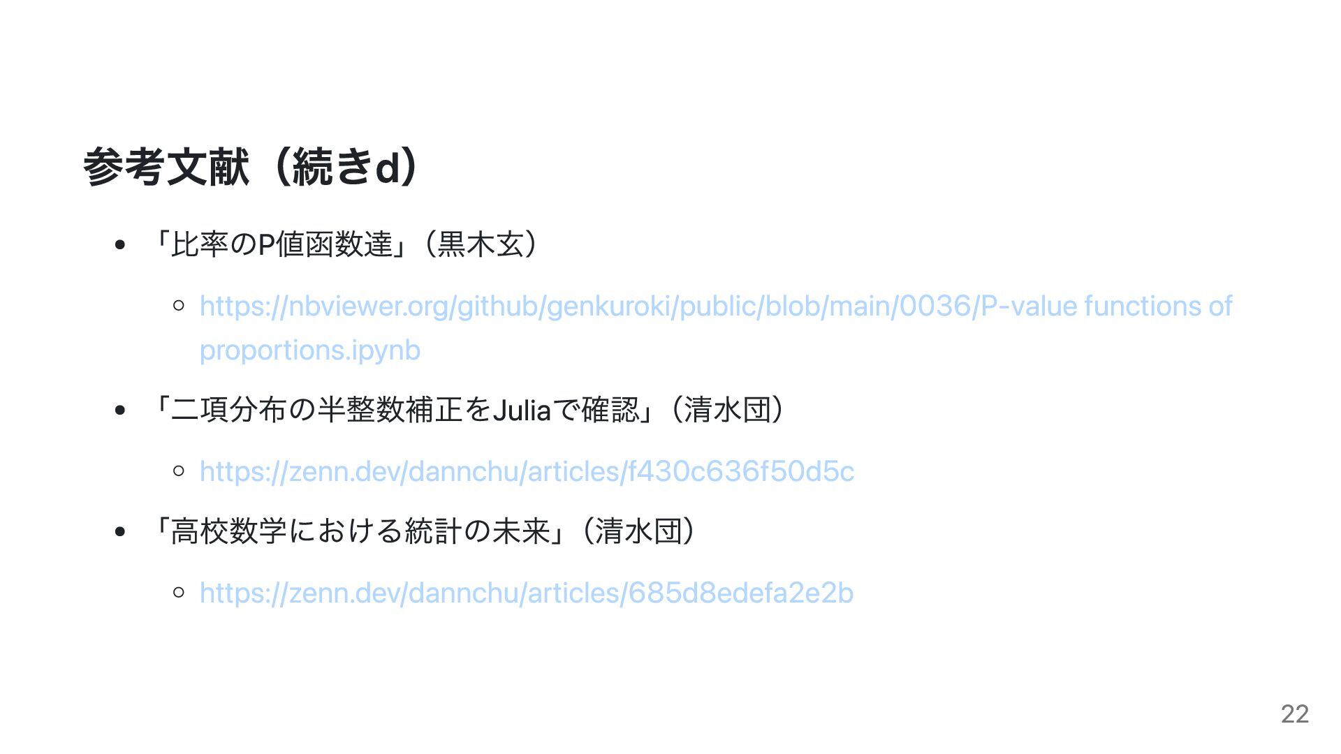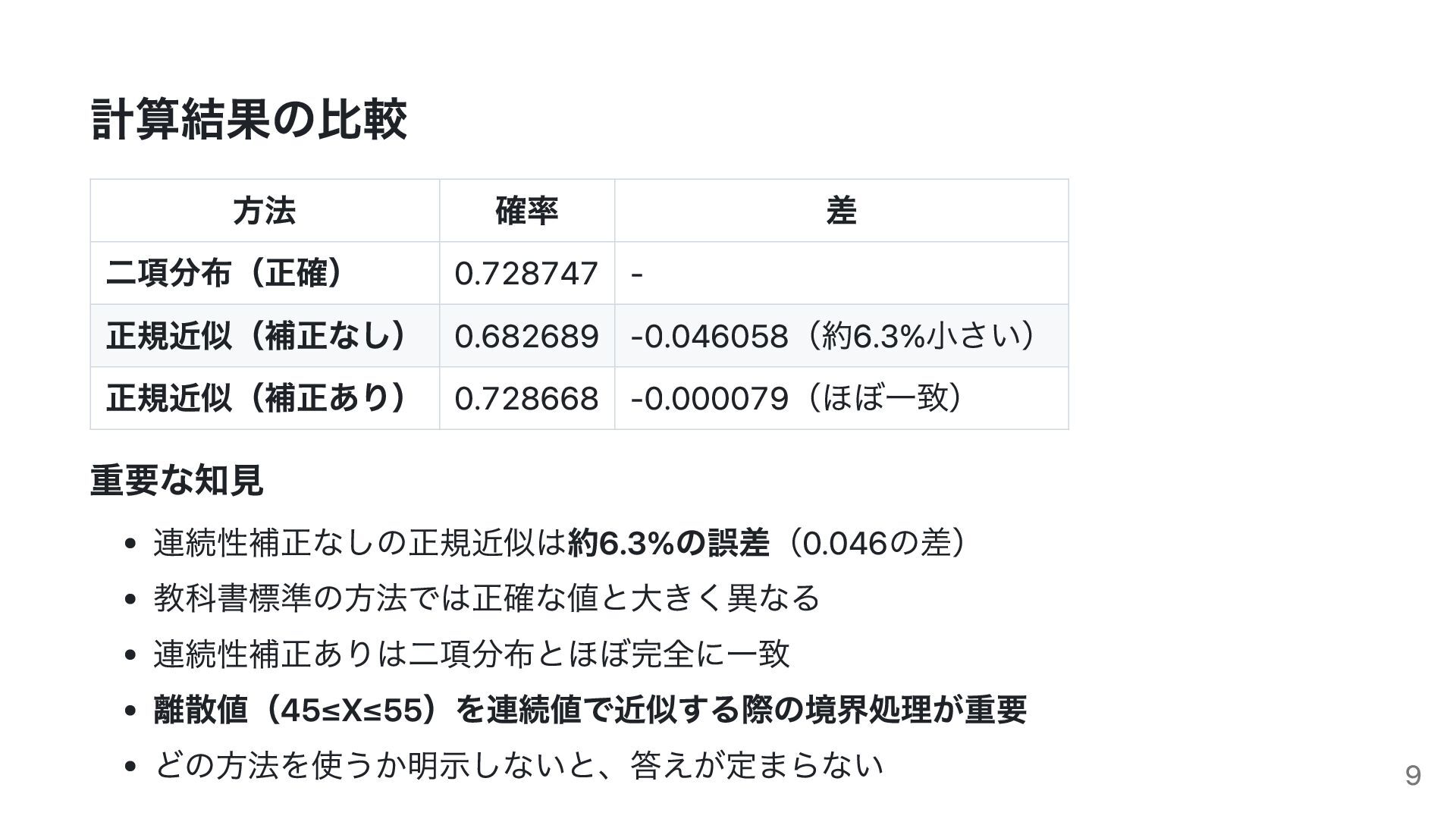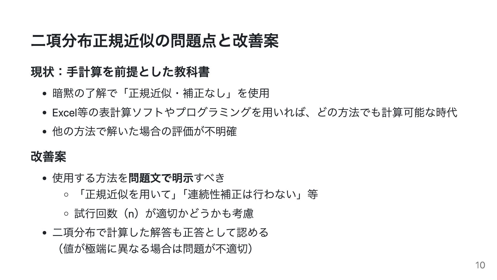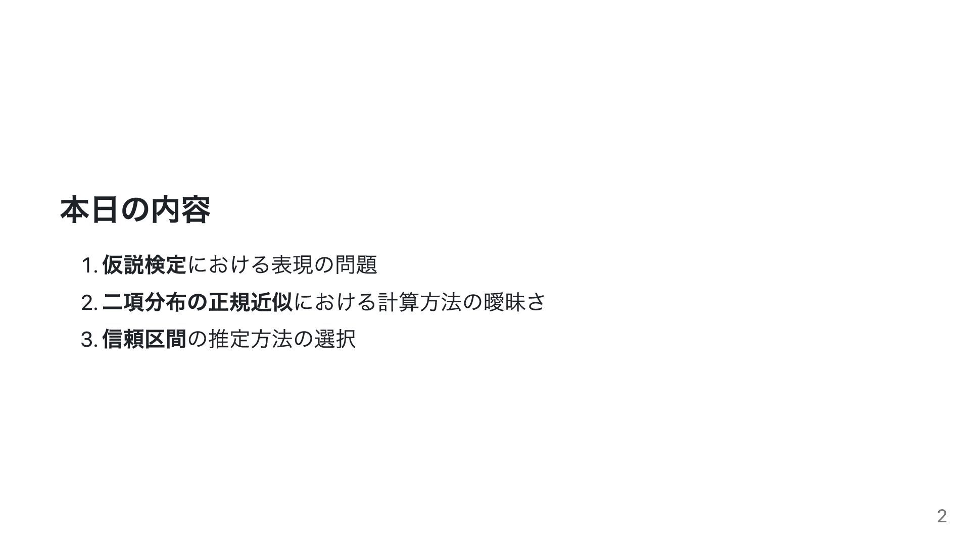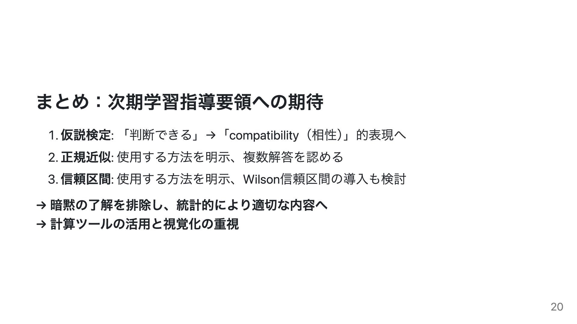 仮説検定における表現の問題、二項分布の正規近似の扱い、信頼区間(Wald/Wilson)の選択などを取り上げ、教科書記述や評価の在り方について統計学的観点から検討します。