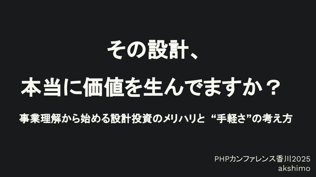 • ビジネスの複雑性・サービスの継続年数などが大きいほど クリーンアーキテクチャなどから受けられるベネフィットは 大きい • MVCと比較するとどこかに「損益分岐点」がある 数年前の登壇にて ちなみに発表タイトルは 「DDDで失敗した俺が異世界転生したら 最強のアーキテクトになった件について」