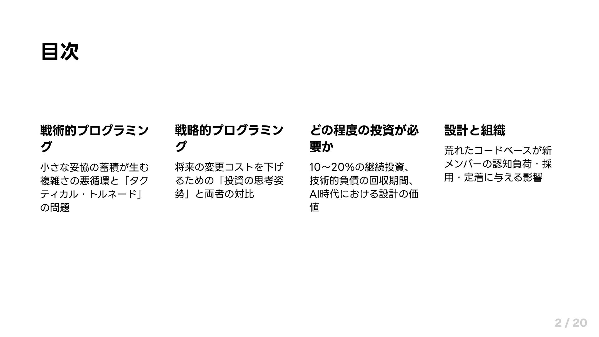 目次 戦略的プログラミン グ 将来の変更コストを下げ るための「投資の思考姿 勢」と両者の対比 どの程度の投資が必 要か 10〜20%の継続投資、 技術的負債の回収期間、