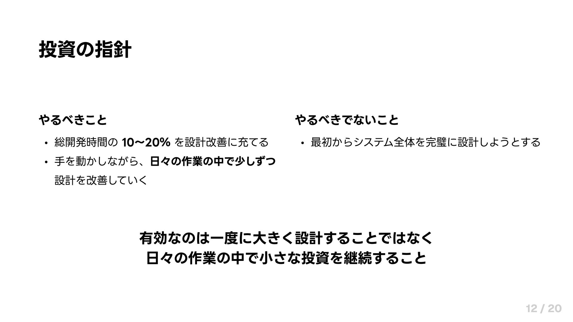 投資の指針 やるべきこと 総開発時間の 10〜20% を設計改善に充てる 手を動かしながら、日々の作業の中で少しずつ 設計を改善していく やるべきでないこと 最初からシステム全体を完璧に設計しようとする 有効なのは一度に大きく設計することではなく