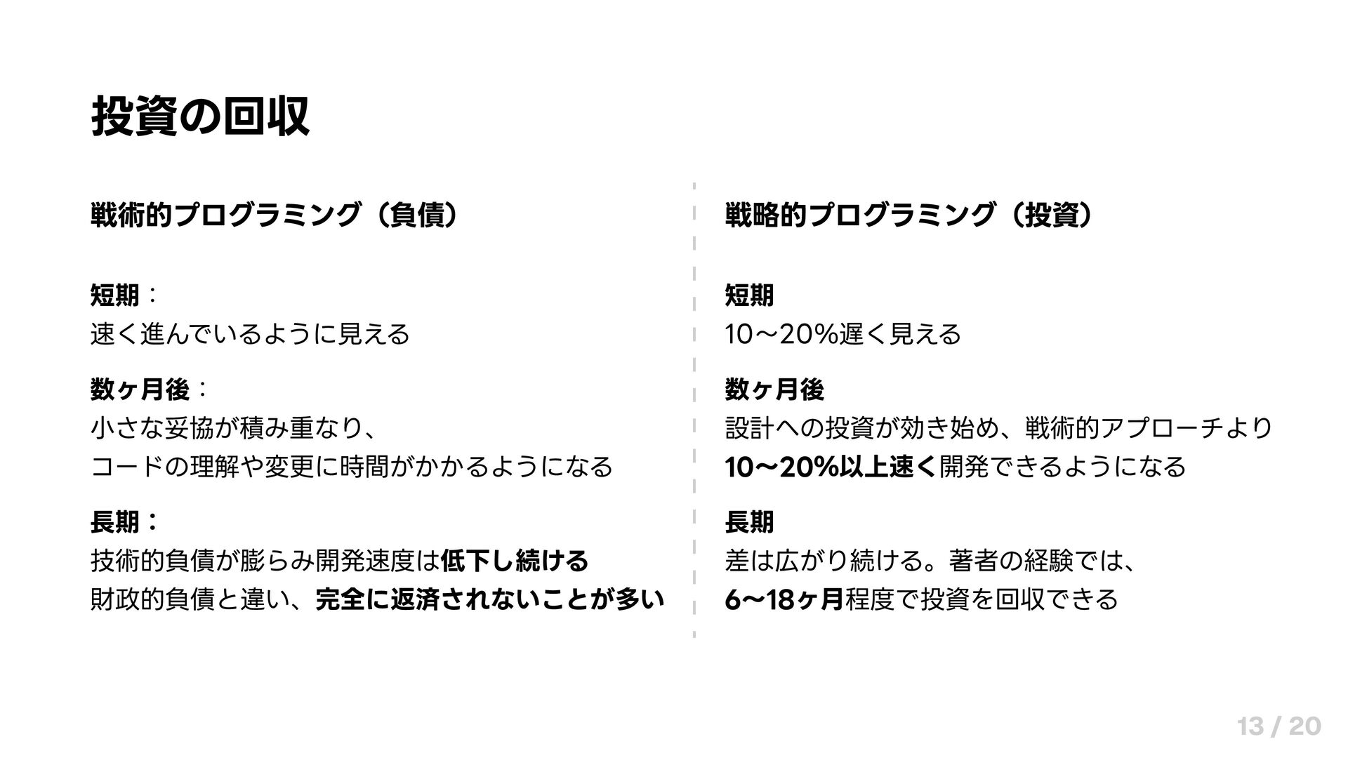 財政的負債と違い、完全に返済されないことが多い 短期 10〜20%遅く見える 数ヶ月後 設計への投資が効き始め、戦術的アプローチより 10〜20%以上速く開発できるようになる 長期 差は広がり続ける。著者の経験では、 6〜18ヶ月程度で投資を回収できる 13 / 20