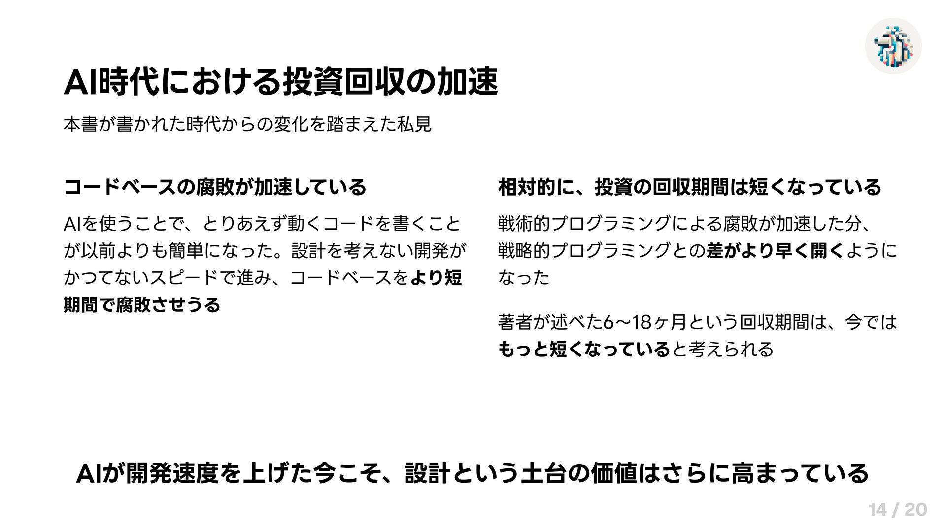 AI時代における投資回収の加速 本書が書かれた時代からの変化を踏まえた私見 コードベースの腐敗が加速している AIを使うことで、とりあえず動くコードを書くこと が以前よりも簡単になった。設計を考えない開発が かつてないスピードで進み、コードベースをより短 期間で腐敗させうる 相対的に、投資の回収期間は短くなっている 戦術的プログラミングによる腐敗が加速した分、 戦略的プログラミングとの差がより早く開くように