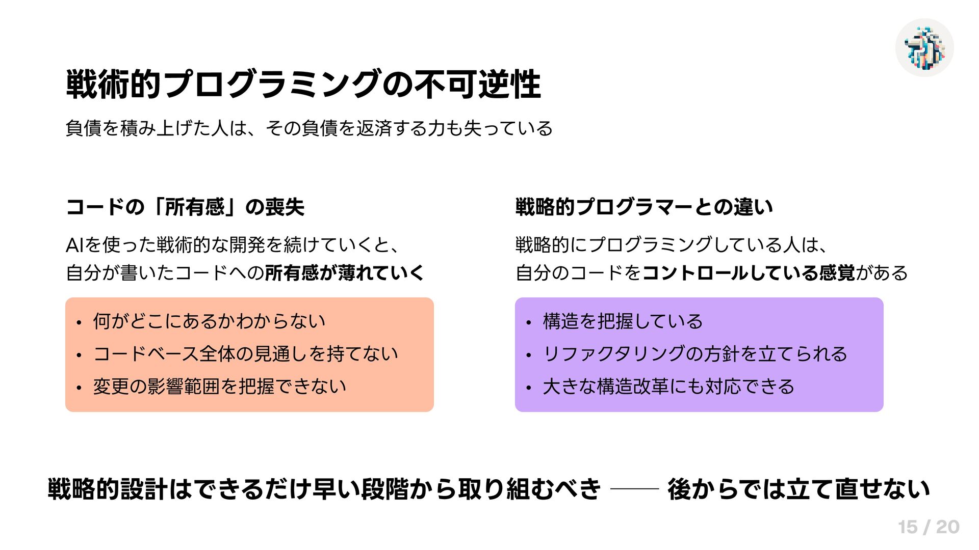 戦術的プログラミングの不可逆性 負債を積み上げた人は、その負債を返済する力も失っている コードの「所有感」の喪失 AIを使った戦術的な開発を続けていくと、 自分が書いたコードへの所有感が薄れていく 戦略的プログラマーとの違い 戦略的にプログラミングしている人は、 自分のコードをコントロールしている感覚がある 何がどこにあるかわからない コードベース全体の見通しを持てない