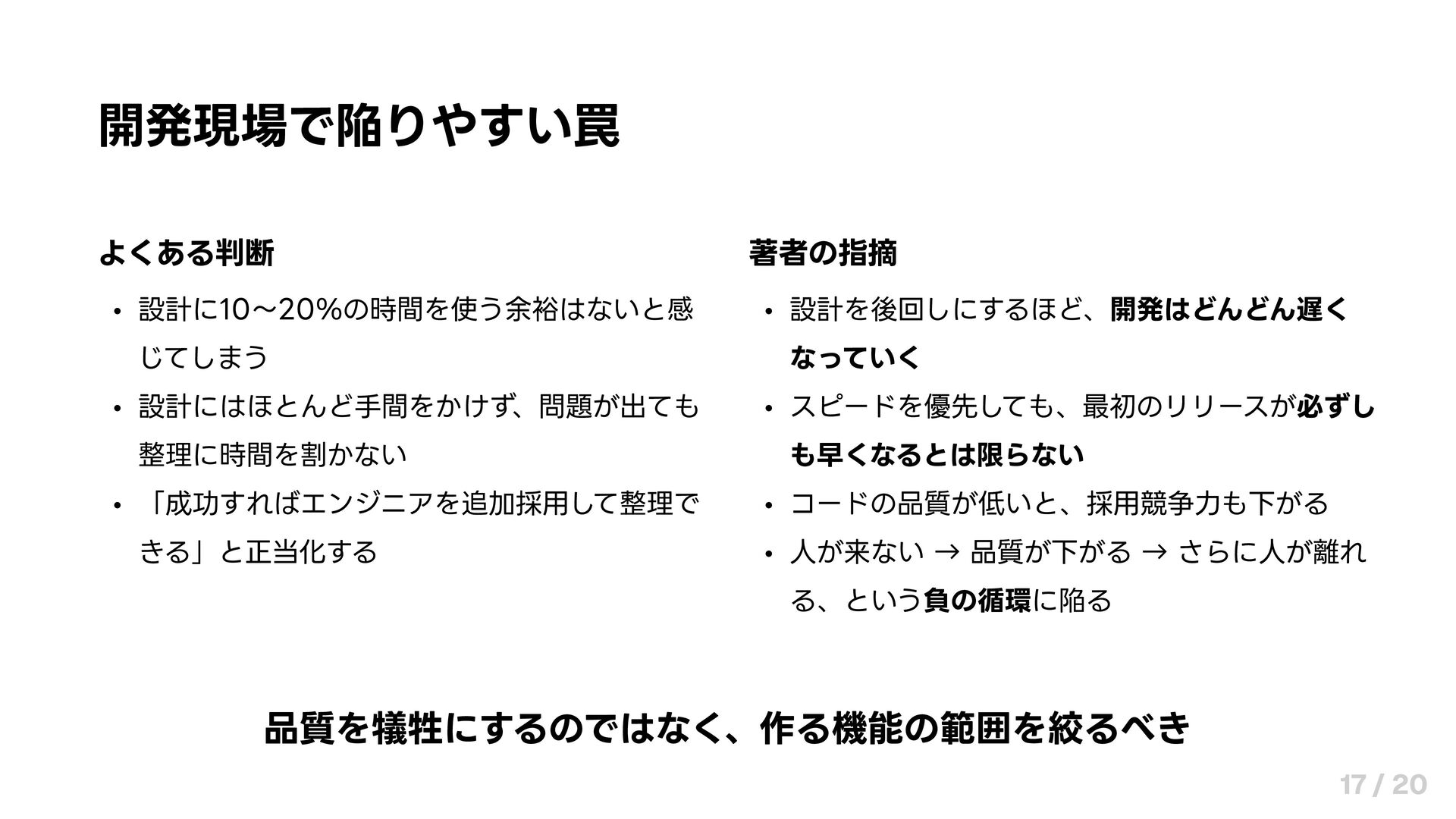 なっていく スピードを優先しても、最初のリリースが必ずし も早くなるとは限らない コードの品質が低いと、採用競争力も下がる 人が来ない → 品質が下がる → さらに人が離れ る、という負の循環に陥る 品質を犠牲にするのではなく、作る機能の範囲を絞るべき 17 / 20