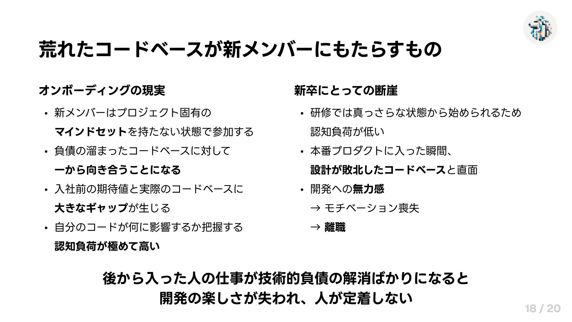新卒にとっての断崖 研修では真っさらな状態から始められるため 認知負荷が低い 本番プロダクトに入った瞬間、 設計が敗北したコードベースと直面 開発への無力感 → モチベーション喪失 → 離職 後から入った人の仕事が技術的負債の解消ばかりになると 開発の楽しさが失われ、人が定着しない 18 / 20