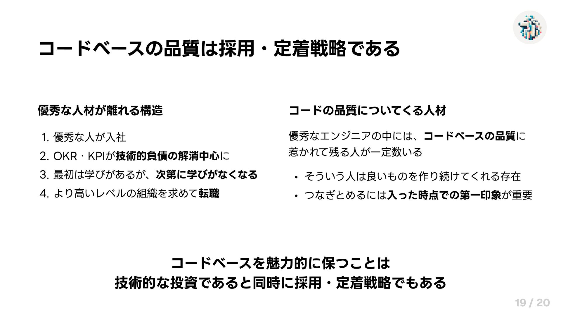 つなぎとめるには入った時点での第一印象が重要 コードベースを魅力的に保つことは 技術的な投資であると同時に採用・定着戦略でもある 19 / 20