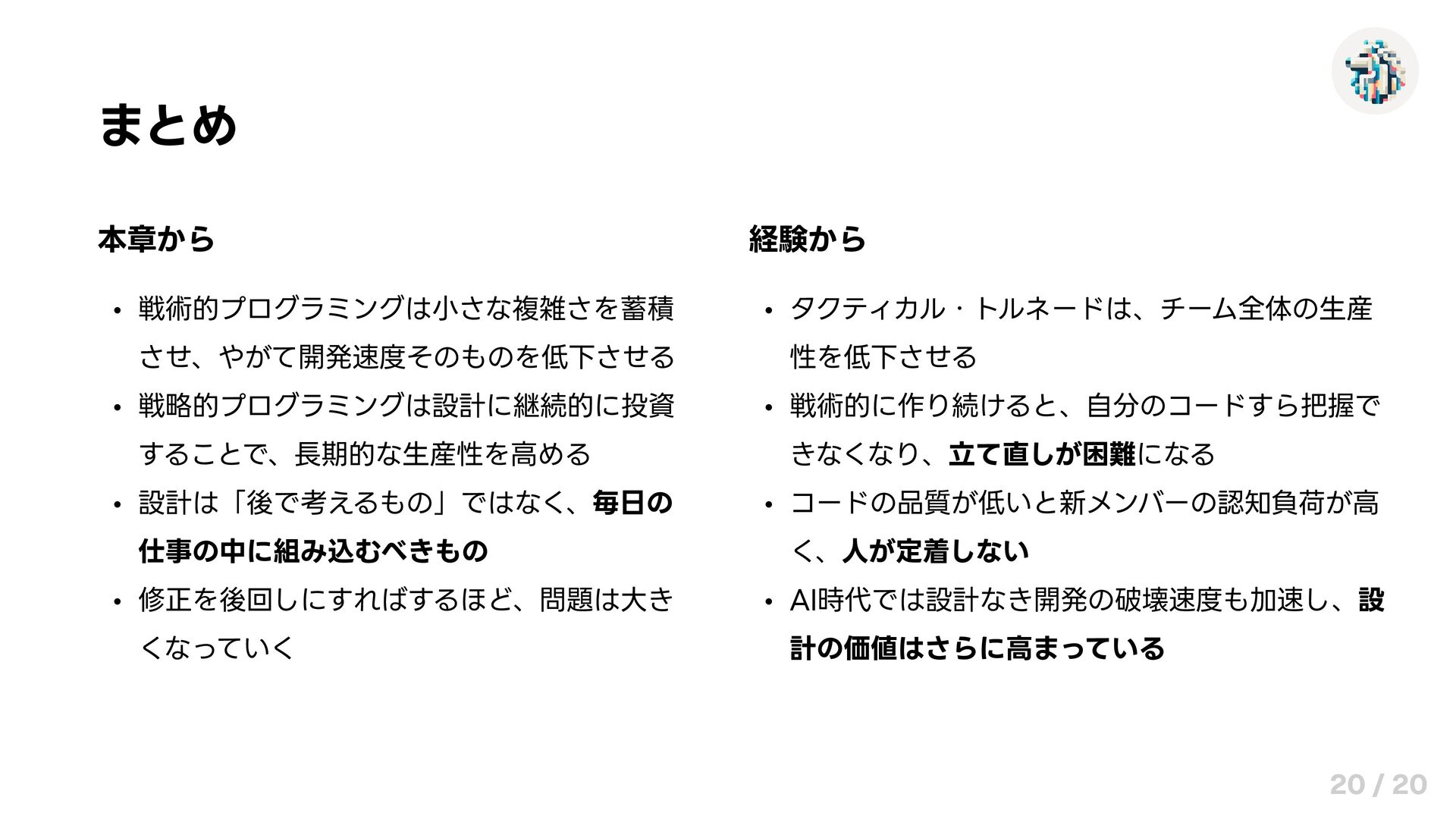 経験から タクティカル・トルネードは、チーム全体の生産 性を低下させる 戦術的に作り続けると、自分のコードすら把握で きなくなり、立て直しが困難になる コードの品質が低いと新メンバーの認知負荷が高 く、人が定着しない AI時代では設計なき開発の破壊速度も加速し、設 計の価値はさらに高まっている 20 / 20