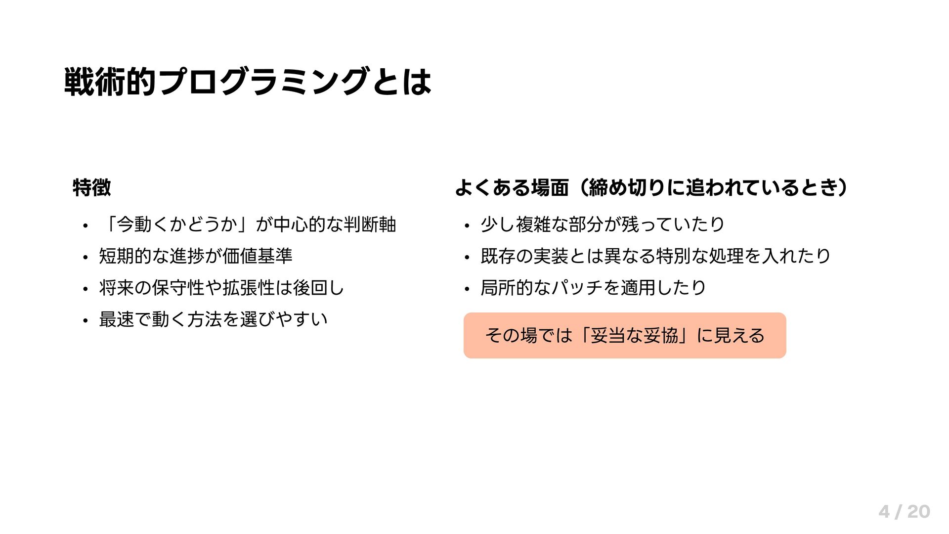 戦術的プログラミングとは 特徴 よくある場面(締め切りに追われているとき) 「今動くかどうか」が中心的な判断軸 短期的な進捗が価値基準 将来の保守性や拡張性は後回し 最速で動く方法を選びやすい 少し複雑な部分が残っていたり 既存の実装とは異なる特別な処理を入れたり 局所的なパッチを適用したり