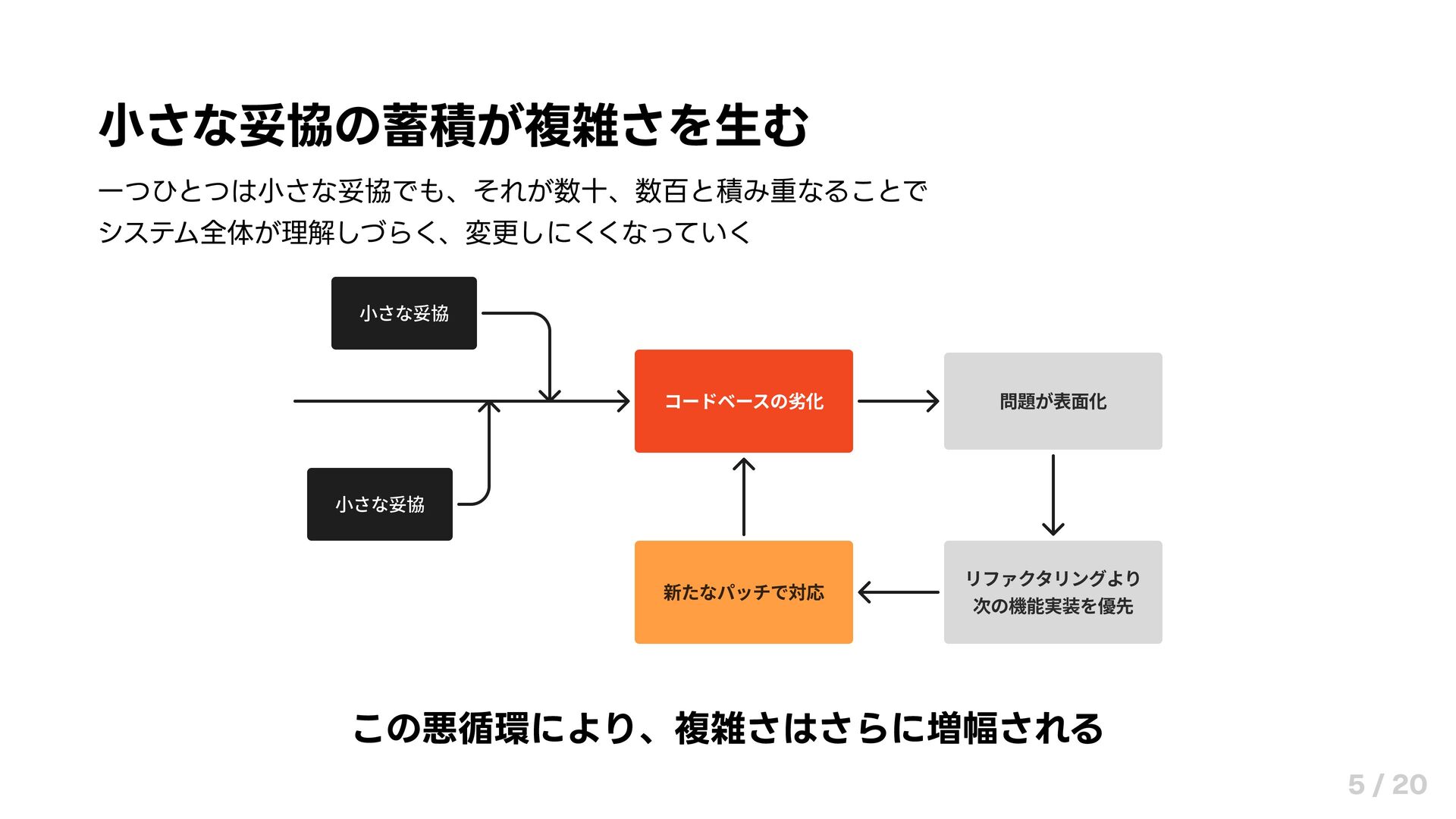 小さな妥協の蓄積が複雑さを生む 一つひとつは小さな妥協でも、それが数十、数百と積み重なることで システム全体が理解しづらく、変更しにくくなっていく この悪循環により、複雑さはさらに増幅される 5 / 20
