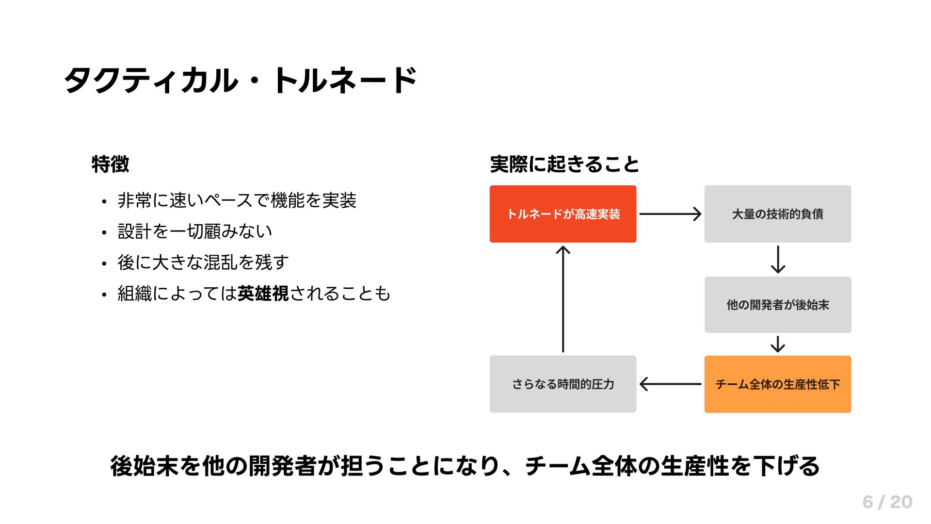 タクティカル・トルネード 特徴 非常に速いペースで機能を実装 設計を一切顧みない 後に大きな混乱を残す 組織によっては英雄視されることも 実際に起きること 後始末を他の開発者が担うことになり、チーム全体の生産性を下げる 6 /